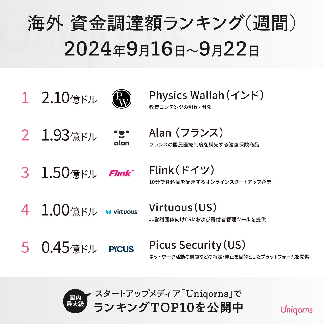 国内最大級のスタートアップメディア「Uniqorns(ユニコーンズ)」が海外2024年9月16日〜9月22日のスタートアップ資金調達状況をランキング形式で発表