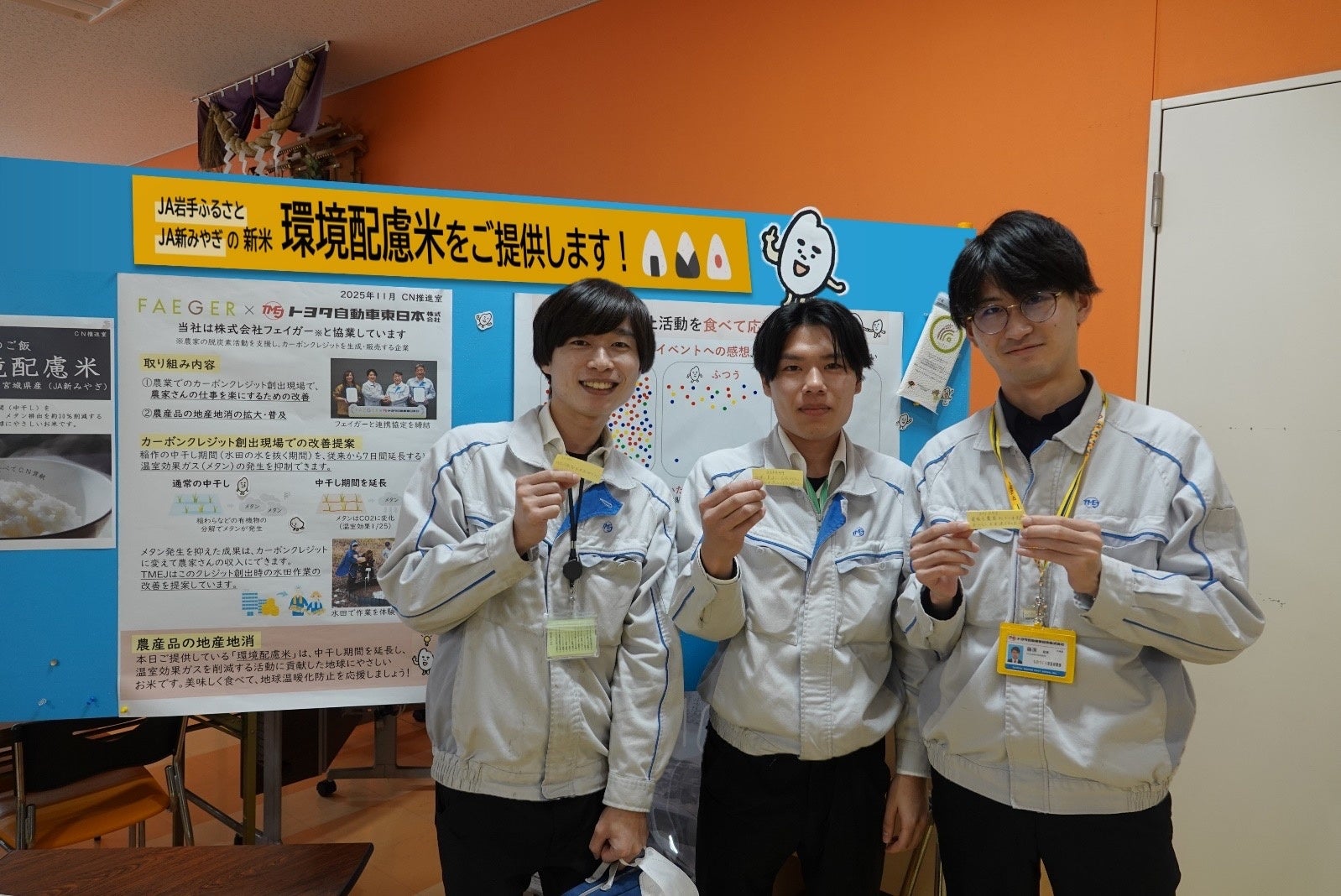株式会社フェイガー(本社:東京都千代田区、代表取締役:石崎貴紘、以下フェイガー)は、2025年11月にトヨタ自動車東日本株式会社(以下、TMEJ)の社員食堂にて実施された“環境配慮米”提供イベントに協力し、当社が推進する「農業の脱炭素化」を起点とした地域価値循環の取り組みを紹介しました。