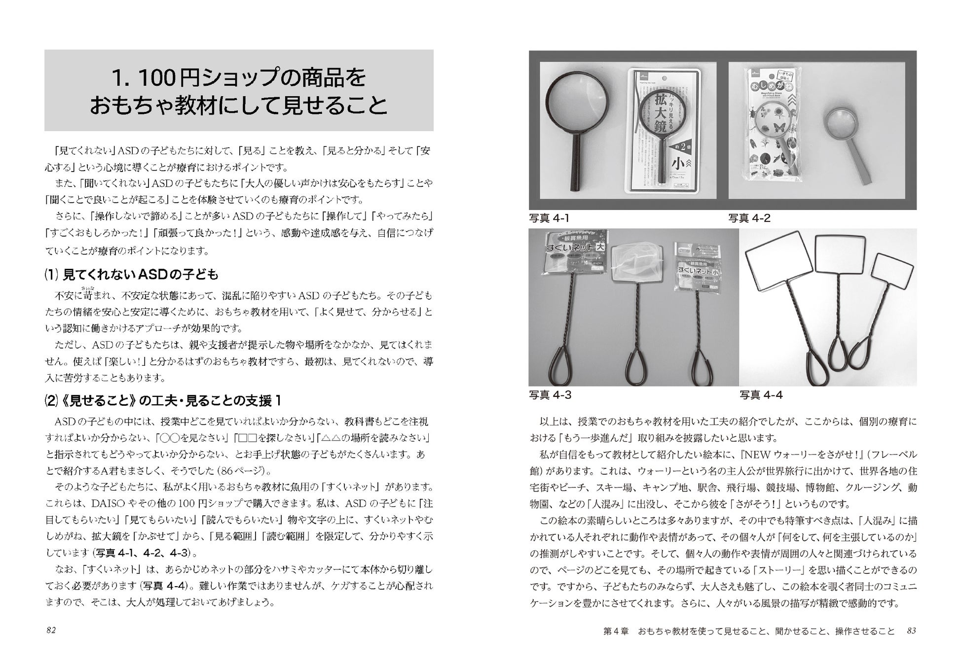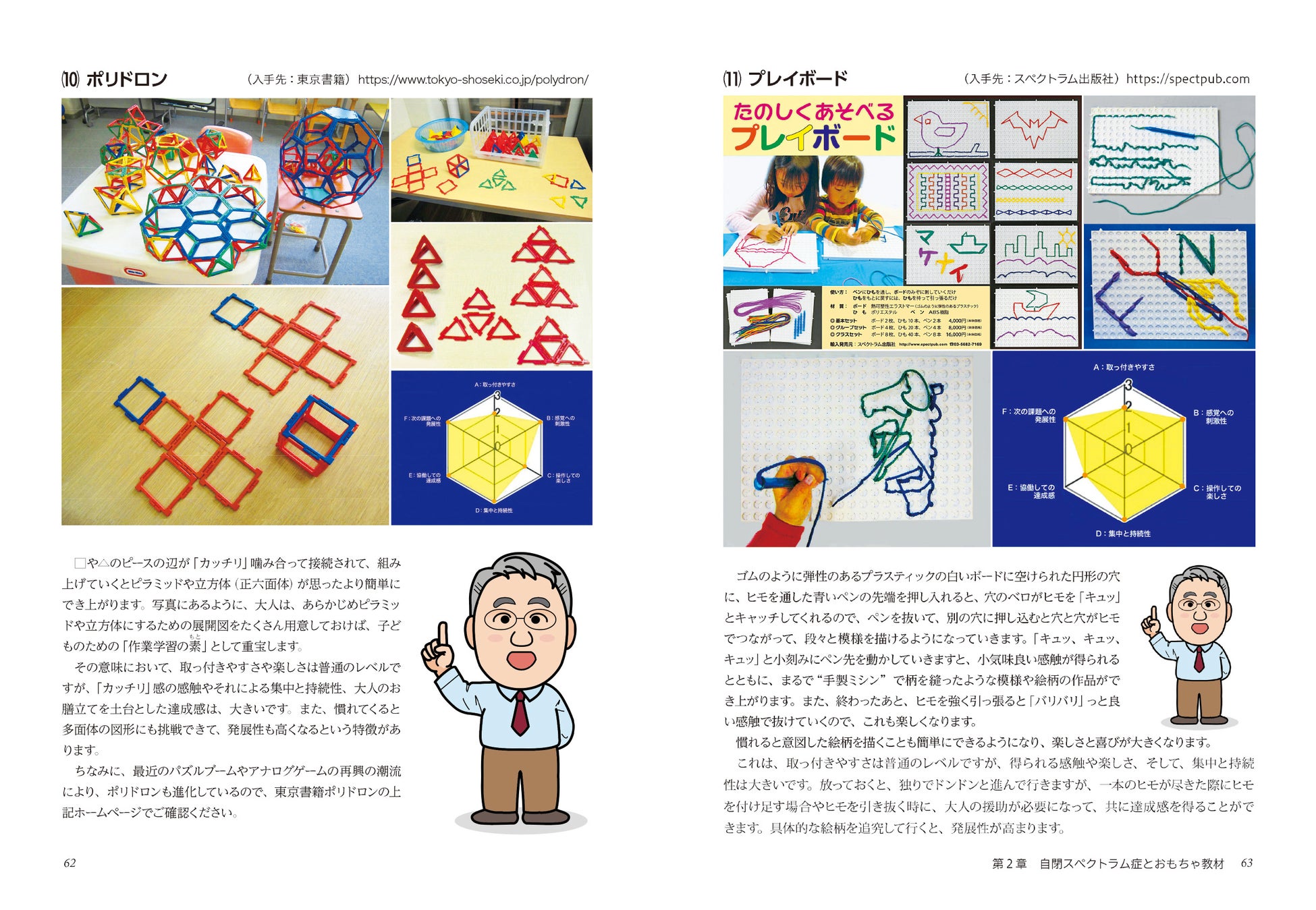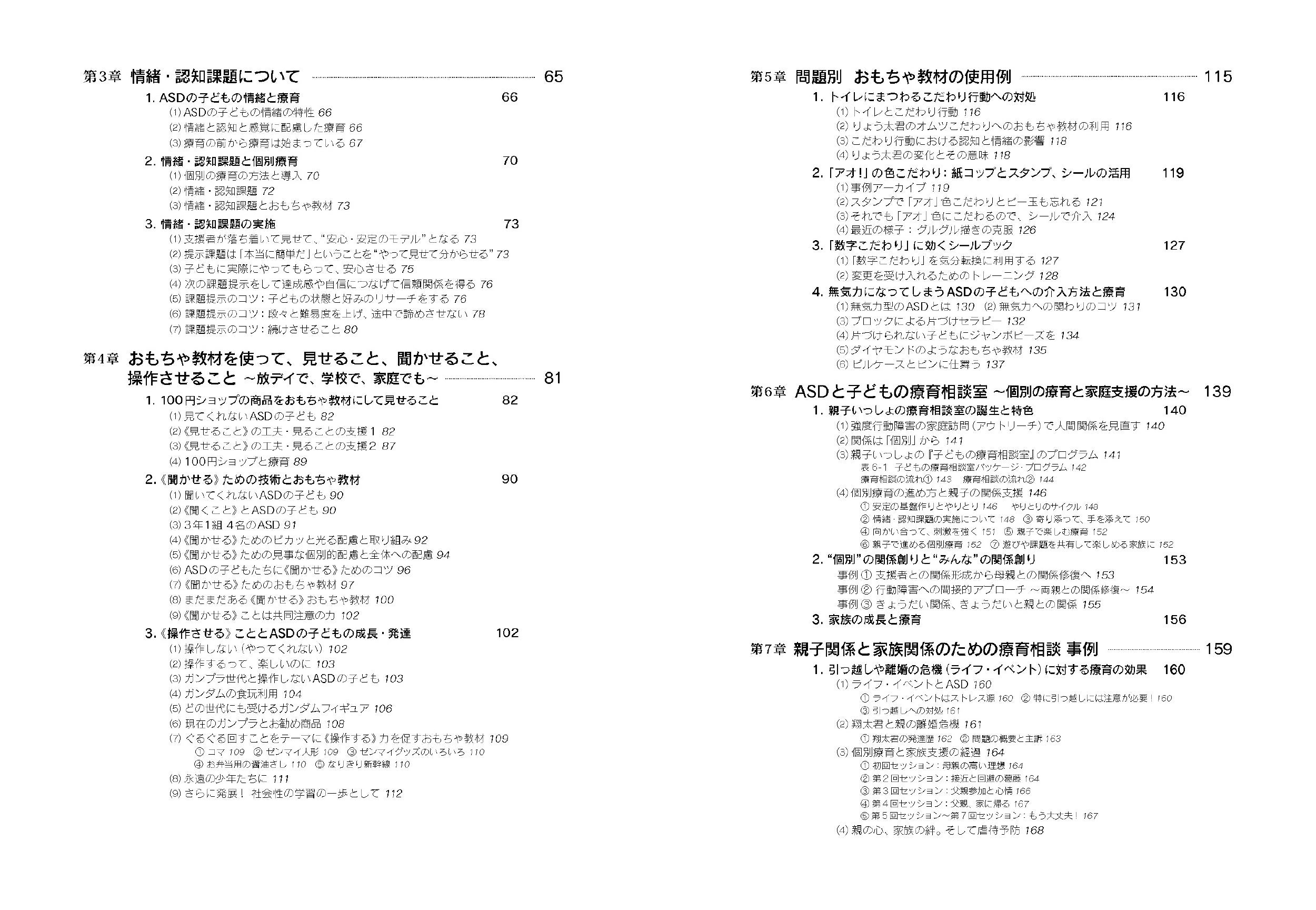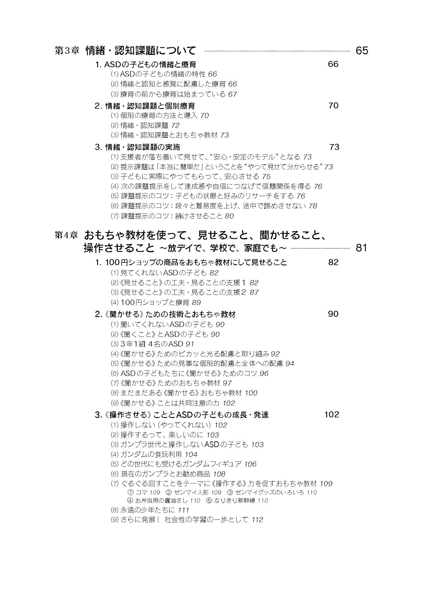 お忙しい皆さんに配慮して、購入しやすくて、すぐに使えるおもちゃ教材を、ふんだんに掲載しています。それらは、個別から集団に至るまで使えるように使用方法も「視覚化」して説明を加えています。これら“おすすめ”のおもちゃ教材を用いて、情緒・認知課題の設定をして、一日のうちで5~10分でも構いませんので、自閉スペクトラム症のお子さんとのやりとりを楽しんでください。子どもとの新たな人間関係が始まると思います。
