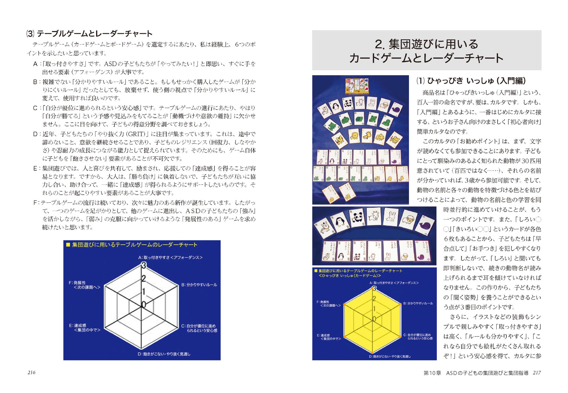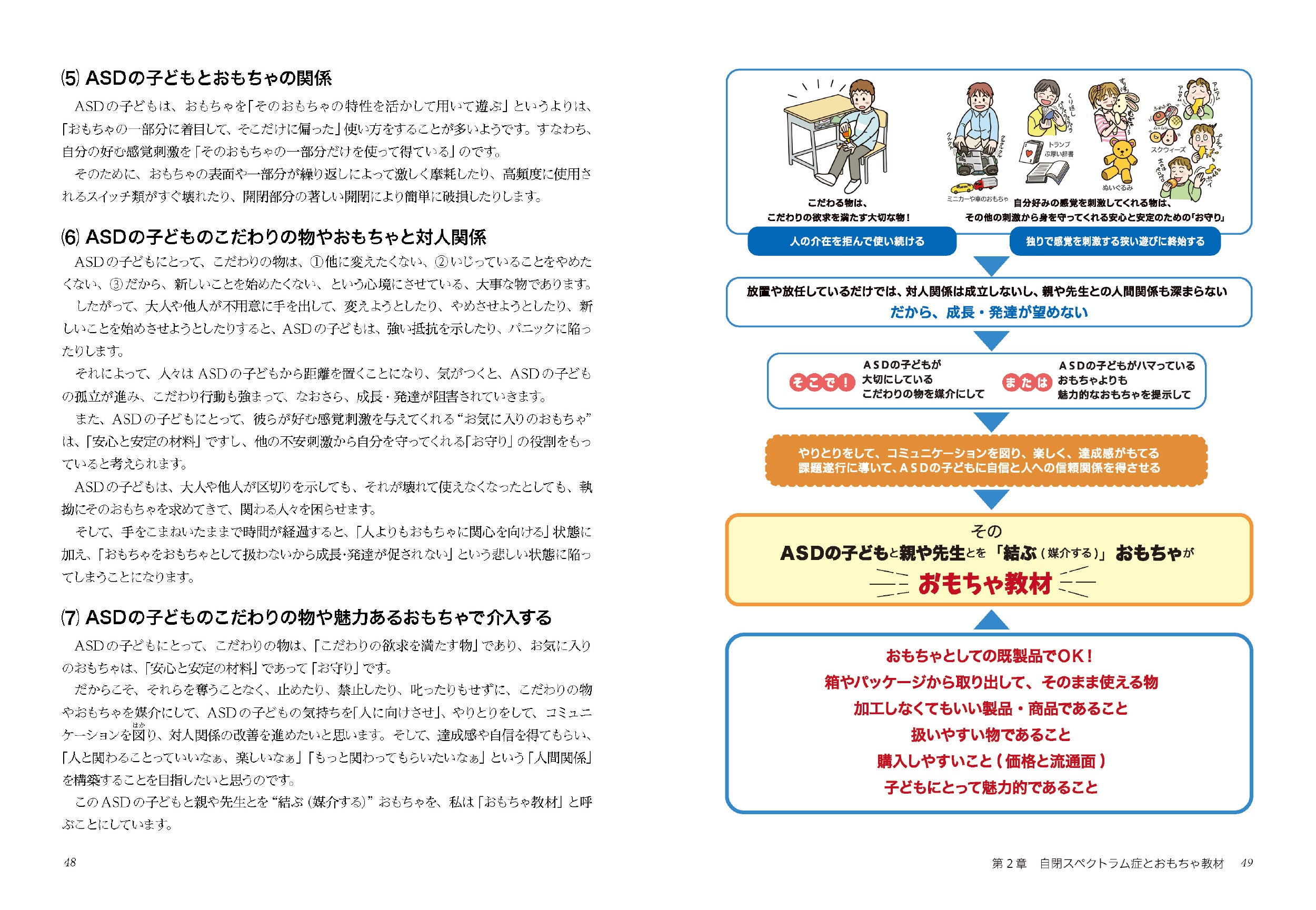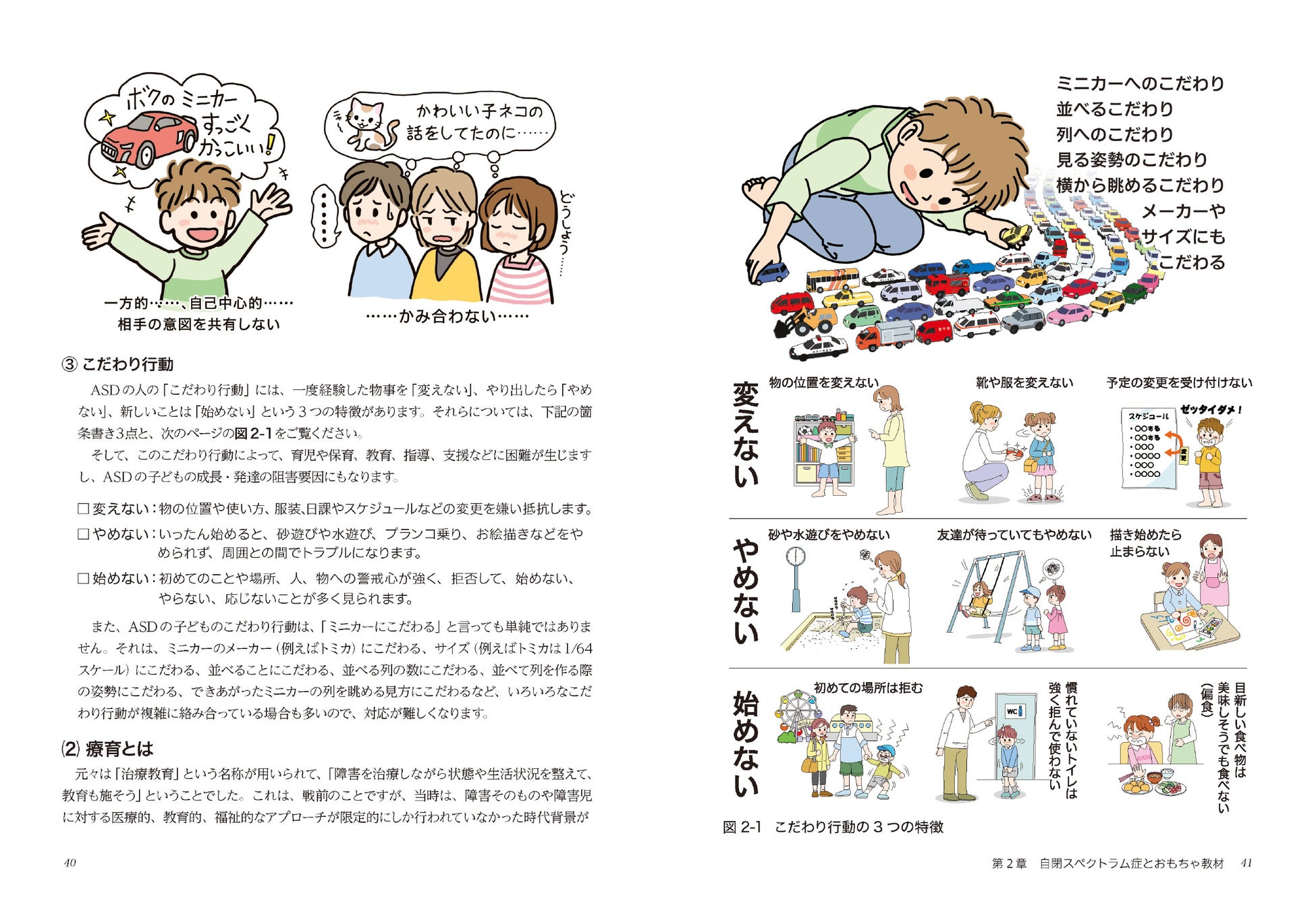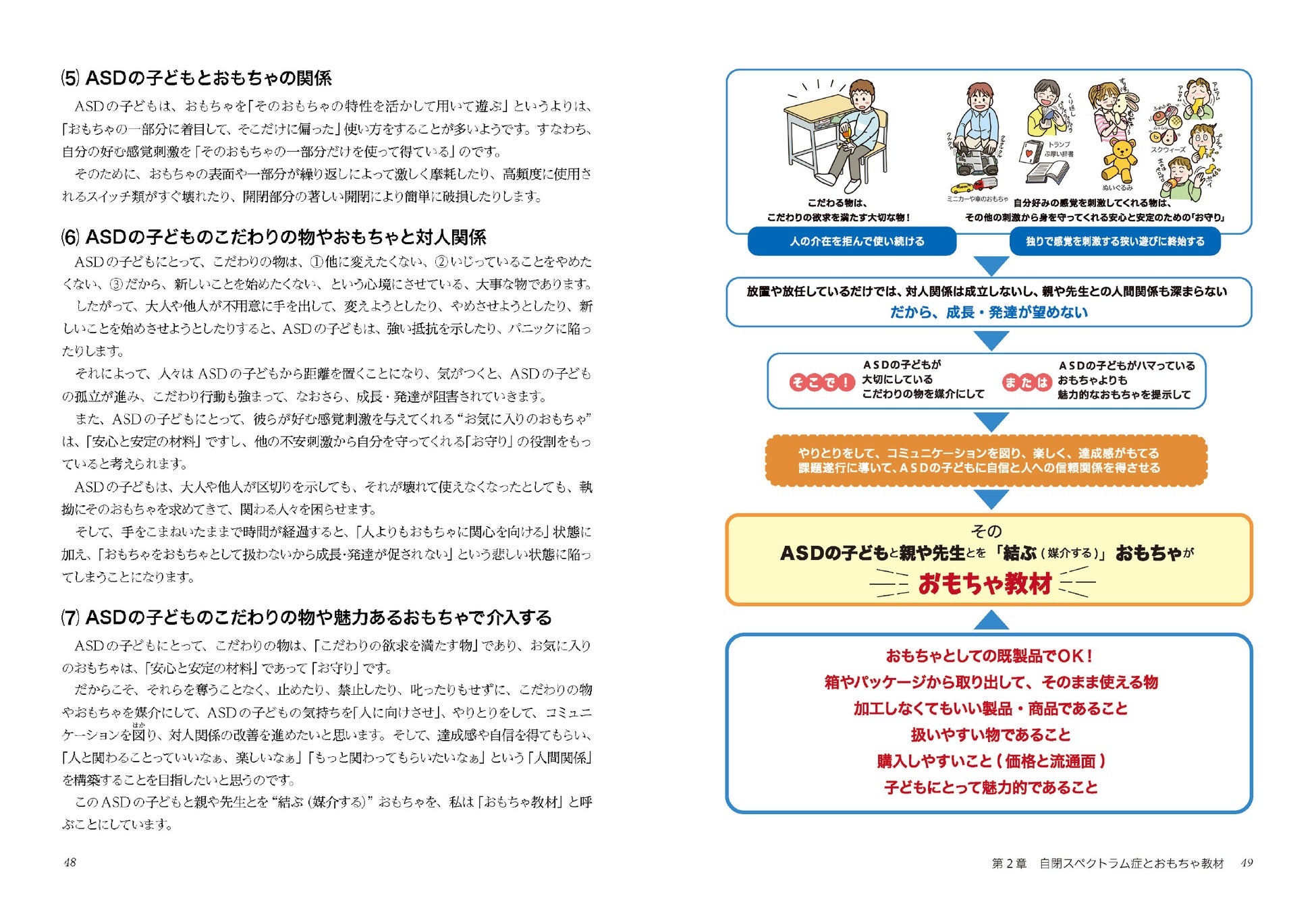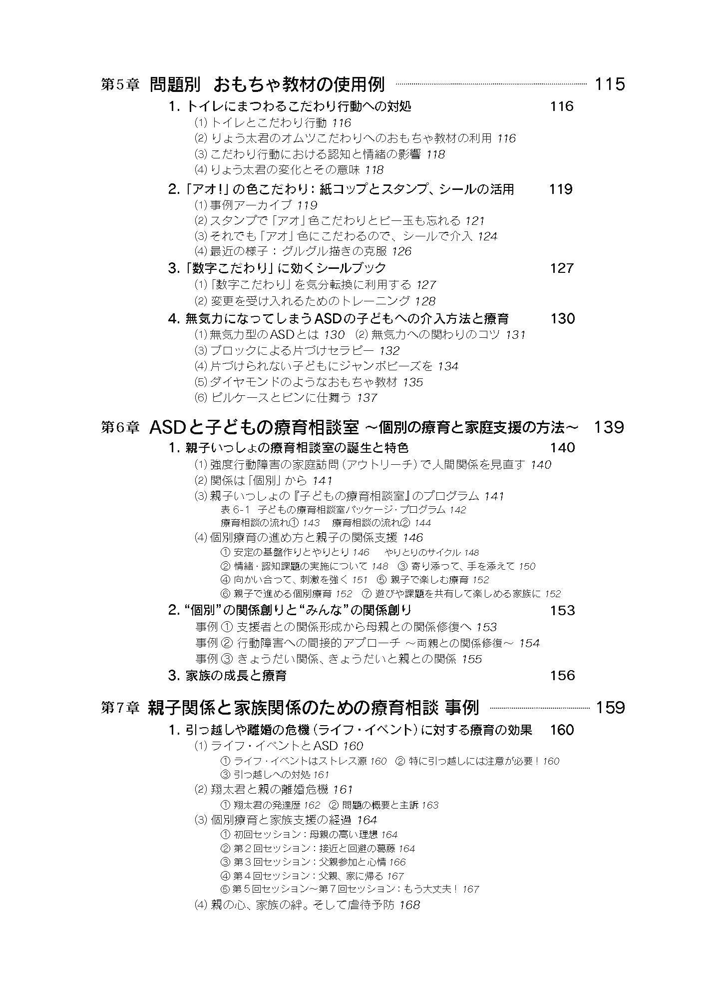 お忙しい皆さんに配慮して、購入しやすくて、すぐに使えるおもちゃ教材を、ふんだんに掲載しています。それらは、個別から集団に至るまで使えるように使用方法も「視覚化」して説明を加えています。これら“おすすめ”のおもちゃ教材を用いて、情緒・認知課題の設定をして、一日のうちで5~10分でも構いませんので、自閉スペクトラム症のお子さんとのやりとりを楽しんでください。子どもとの新たな人間関係が始まると思います。