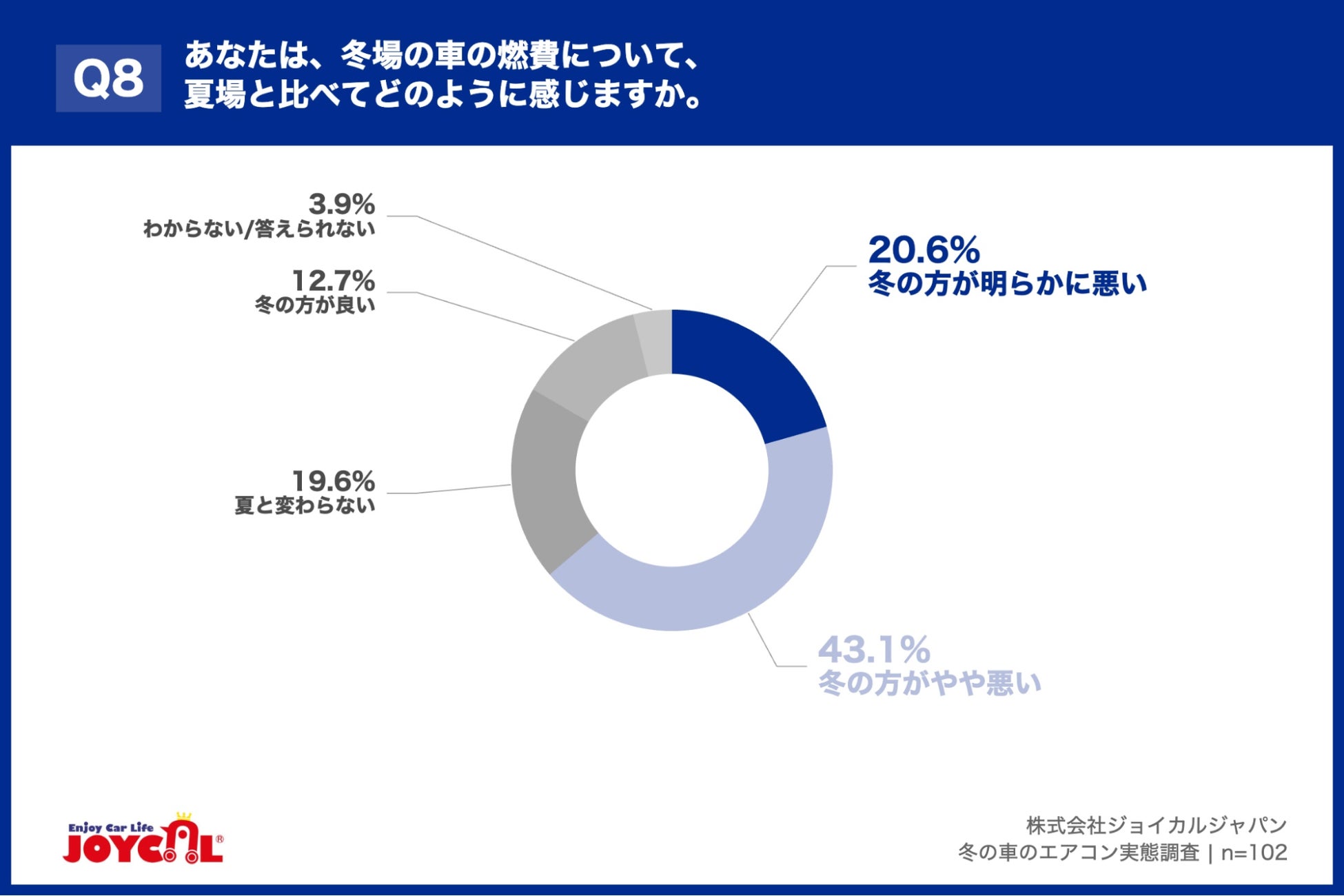 「Q8. あなたは、冬場の車の燃費について、夏場と比べてどのように感じますか。」(n=102)と質問したところ、「冬の方が明らかに悪い」が20.6%、「冬の方がやや悪い」が43.1%という回答となりました。
