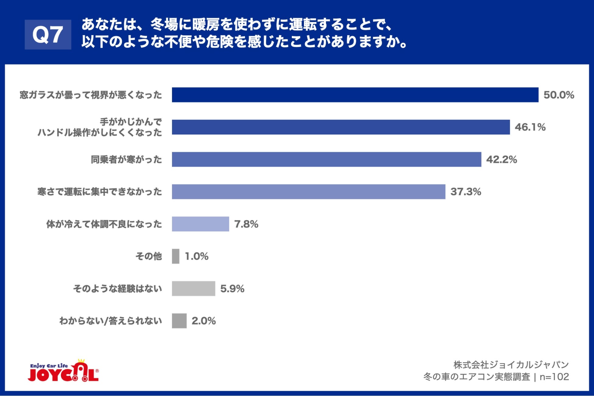「Q7. あなたは、冬場に暖房を使わずに運転することで、以下のような不便や危険を感じたことがありますか。(複数回答)」(n=102)と質問したところ、「窓ガラスが曇って視界が悪くなった」が50.0%、「手がかじかんでハンドル操作がしにくくなった」が46.1%、「同乗者が寒がった」が42.2%という回答となりました。