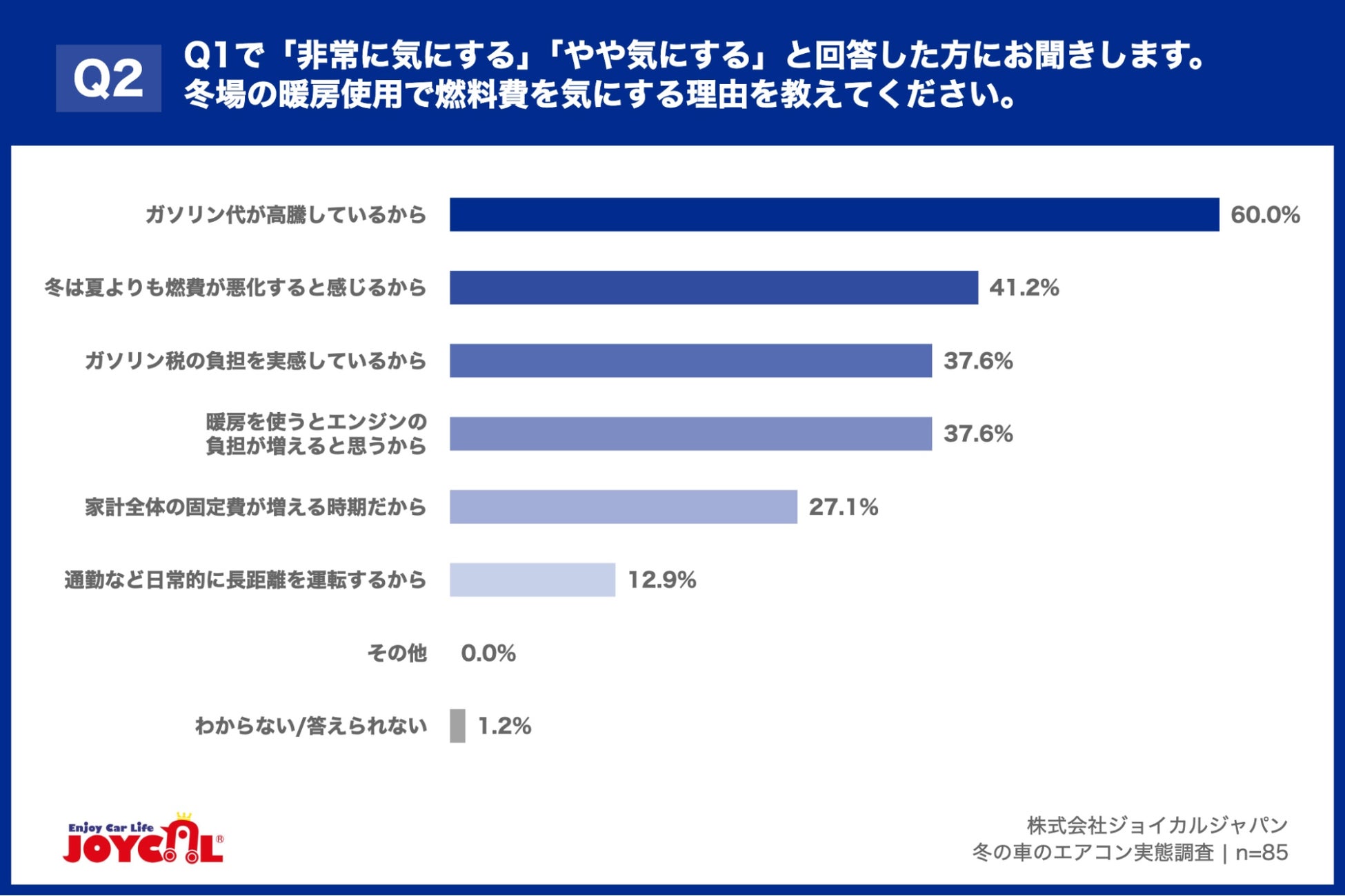 「Q2. Q1で「非常に気にする」「やや気にする」と回答した方にお聞きします。冬場の暖房使用で燃料費を気にする理由を教えてください。(複数回答)」(n=85)と質問したところ、「ガソリン代が高騰しているから」が60.0%、「冬は夏よりも燃費が悪化すると感じるから」が41.2%、「ガソリン税の負担を実感しているから」が37.6%という回答となりました。