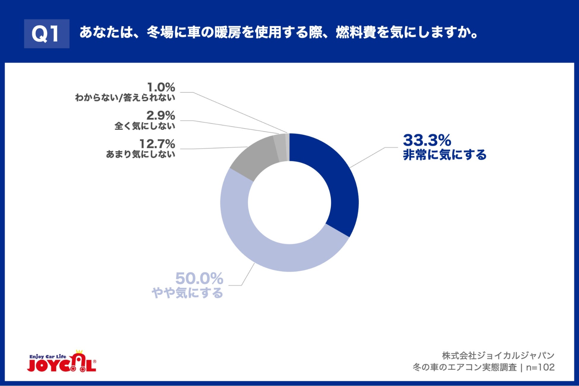 「Q1. あなたは、冬場に車の暖房(エアコン)を使用する際、燃料費を気にしますか。」(n=102)と質問したところ、「非常に気にする」が33.3%、「やや気にする」が50.0%という回答となりました。