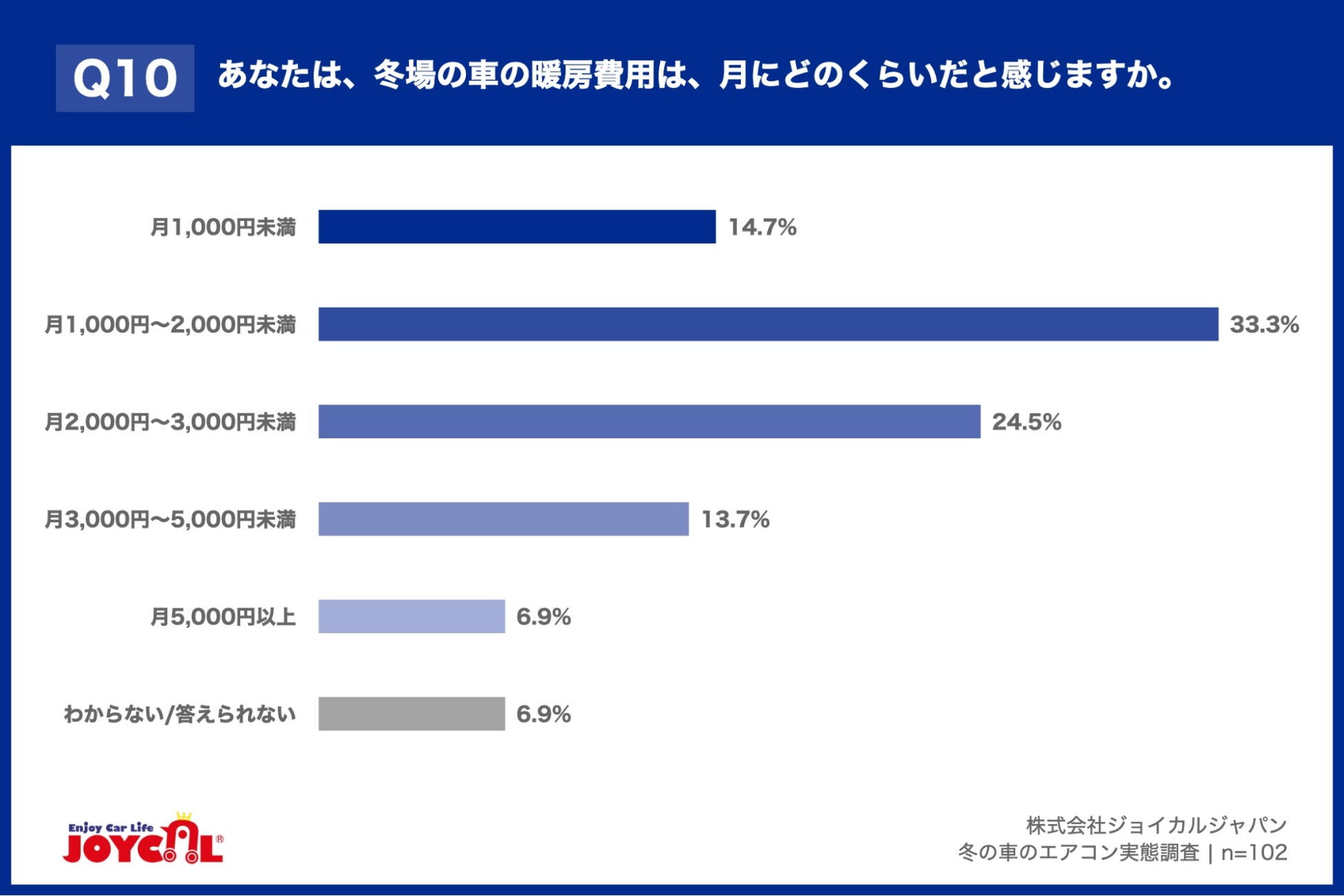 「Q10. あなたは、冬場の車の暖房費用(ガソリン代の増加分)は、月にどのくらいだと感じますか。」(n=102)と質問したところ、「月1,000円未満」が14.7%、「月1,000円~2,000円未満」が33.3%という回答となりました。