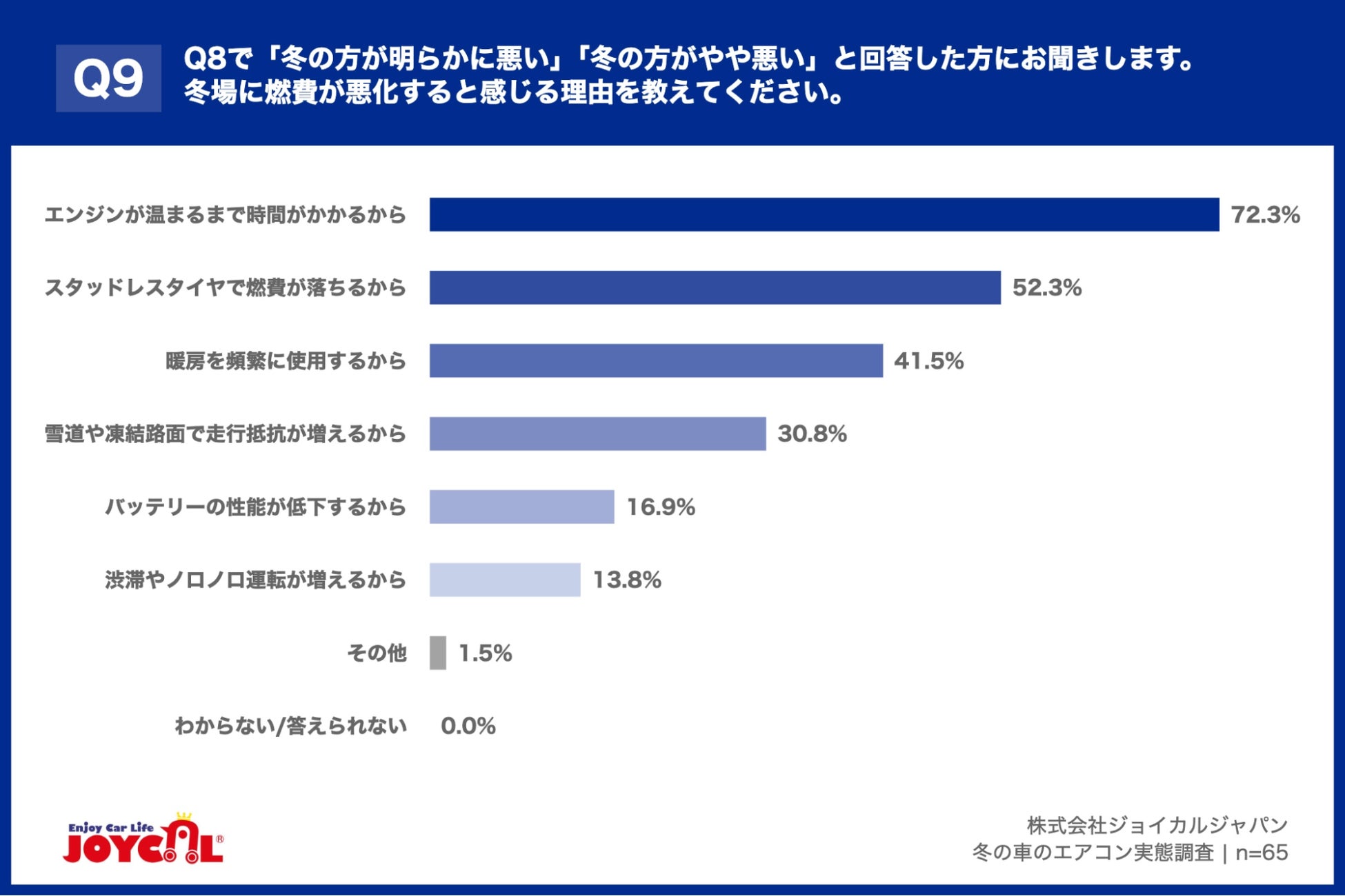 「Q9. Q8で「冬の方が明らかに悪い」「冬の方がやや悪い」と回答した方にお聞きします。冬場に燃費が悪化すると感じる理由を教えてください。(複数回答)」(n=65)と質問したところ、「エンジンが温まるまで時間がかかるから」が72.3%、「スタッドレスタイヤで燃費が落ちるから」が52.3%、「暖房を頻繁に使用するから」が41.5%という回答となりました。