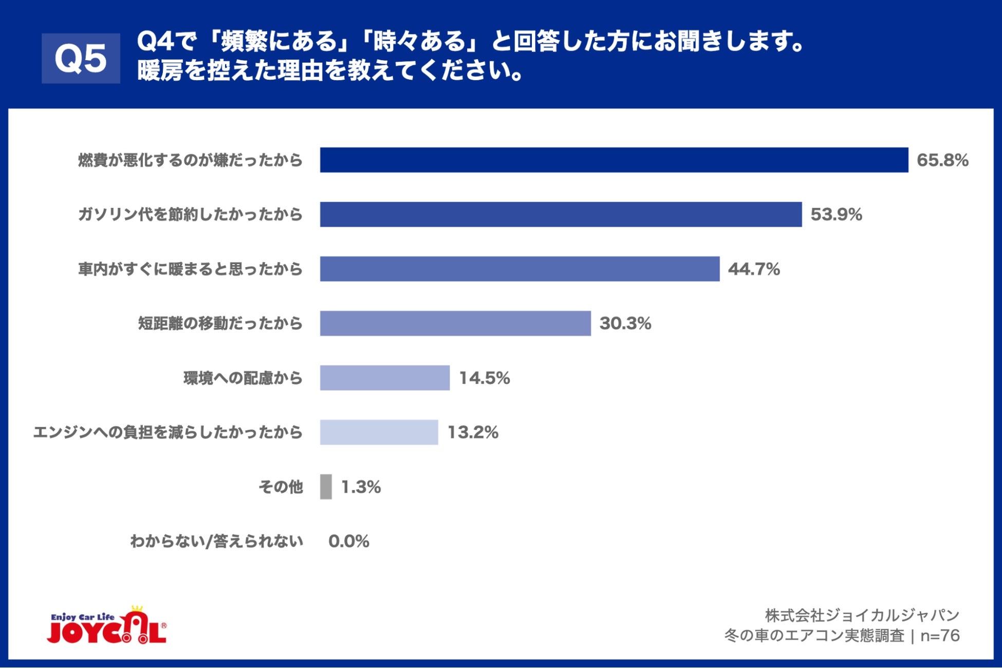 「Q5. Q4で「頻繁にある」「時々ある」と回答した方にお聞きします。暖房を控えた理由を教えてください。(複数回答)」(n=76)と質問したところ、「燃費が悪化するのが嫌だったから」が65.8%、「ガソリン代を節約したかったから」が53.9%、「車内がすぐに暖まると思ったから」が44.7%という回答となりました。