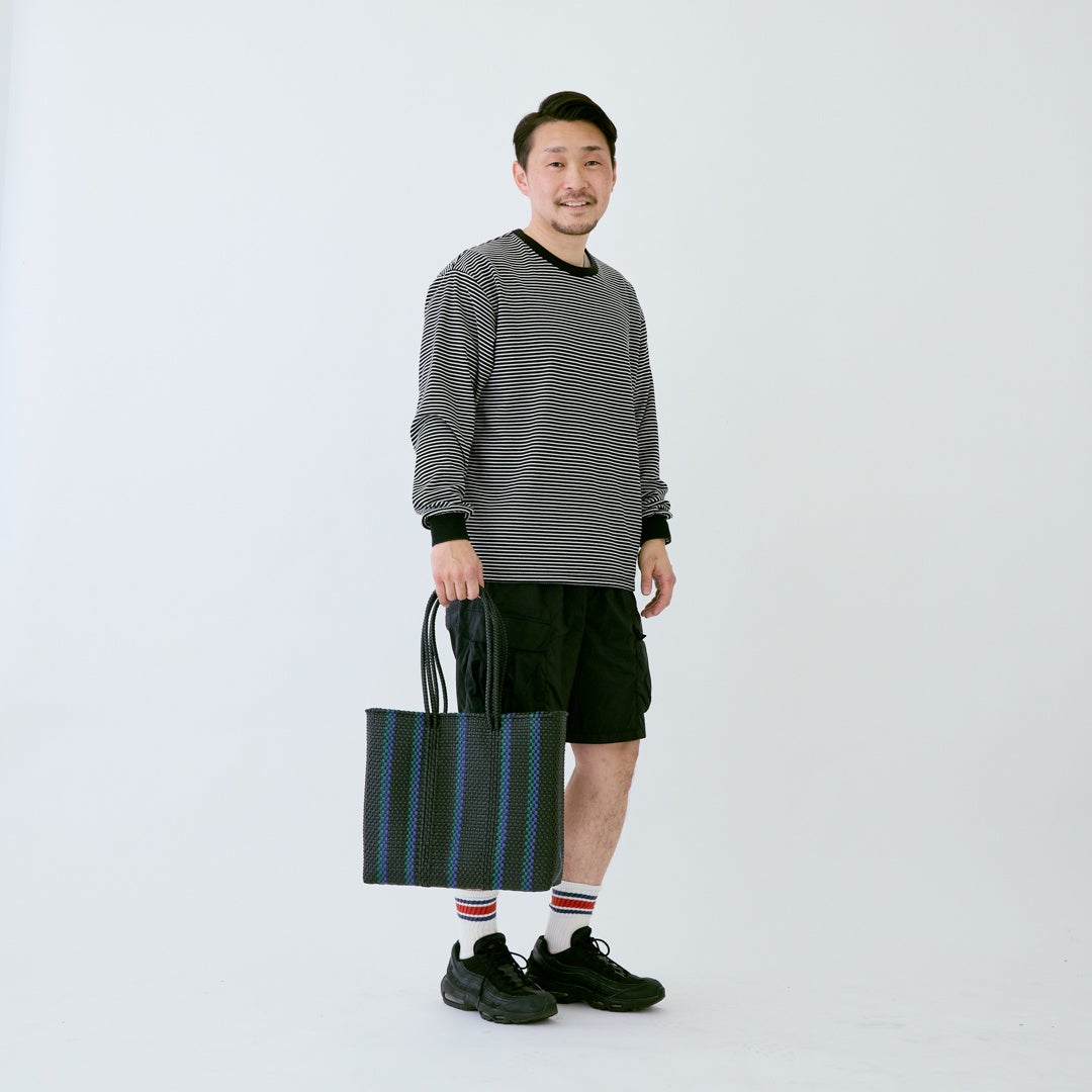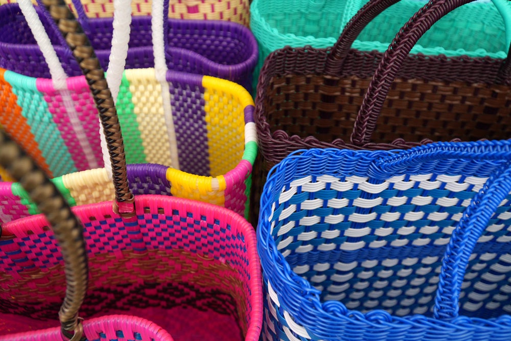 メキシコの職人が再生プラスチックコードを一つ一つ手で編み、メルカドバッグを生産することで、新たな価値ある形に変化させる。