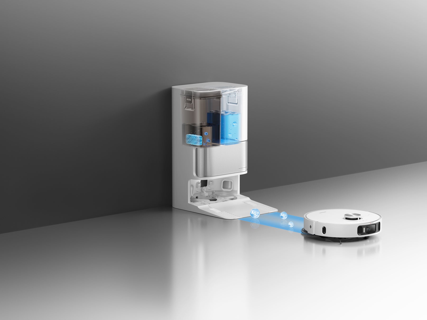 ゴミの収集、モップの洗浄・熱風乾燥、底部のモップウォッシュボード洗浄、水拭き機能用の給水、洗剤の投入などを全て全自動で行い、あらゆるメンテナンスを手間要らずで実行できます。モップ洗浄は75℃の高温の水※2で行い、清潔な状態を保ちます。冷水でのモップ洗浄は油汚れが取れにくいですが、75℃と高温の水を使うことで、油汚れが落ちやすくなったり、洗剤が溶けやすく洗浄効果が上がったりします。温水自動洗浄・熱風乾燥により、常にモップパッドを清潔に保ち、臭いやカビの発生を防ぎます。また、汚水タンクには処理時の悪臭を抑える消臭モジュールも付いています。