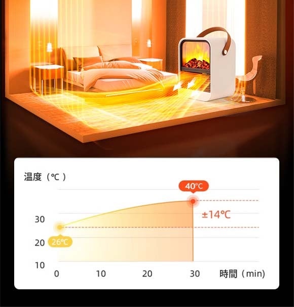 ①1秒速暖、快適な環境を実現!わずか30分程度で室内温度は10℃以上上昇します。