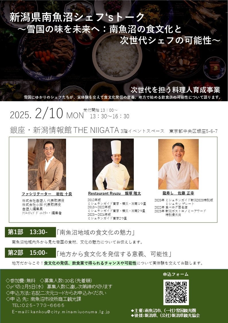 2025年2月10日(月)、南魚沼市は次世代を担う料理人に向けて雪国の食文化の魅力、そこで飲食店を始めることの可能性について語るトークイベントを「銀座・新潟情報館 THE NIIGATA」にて開催します。将来、地方で飲食店の開業を考えている方、新たなチャンスを探している方はぜひご参加ください。