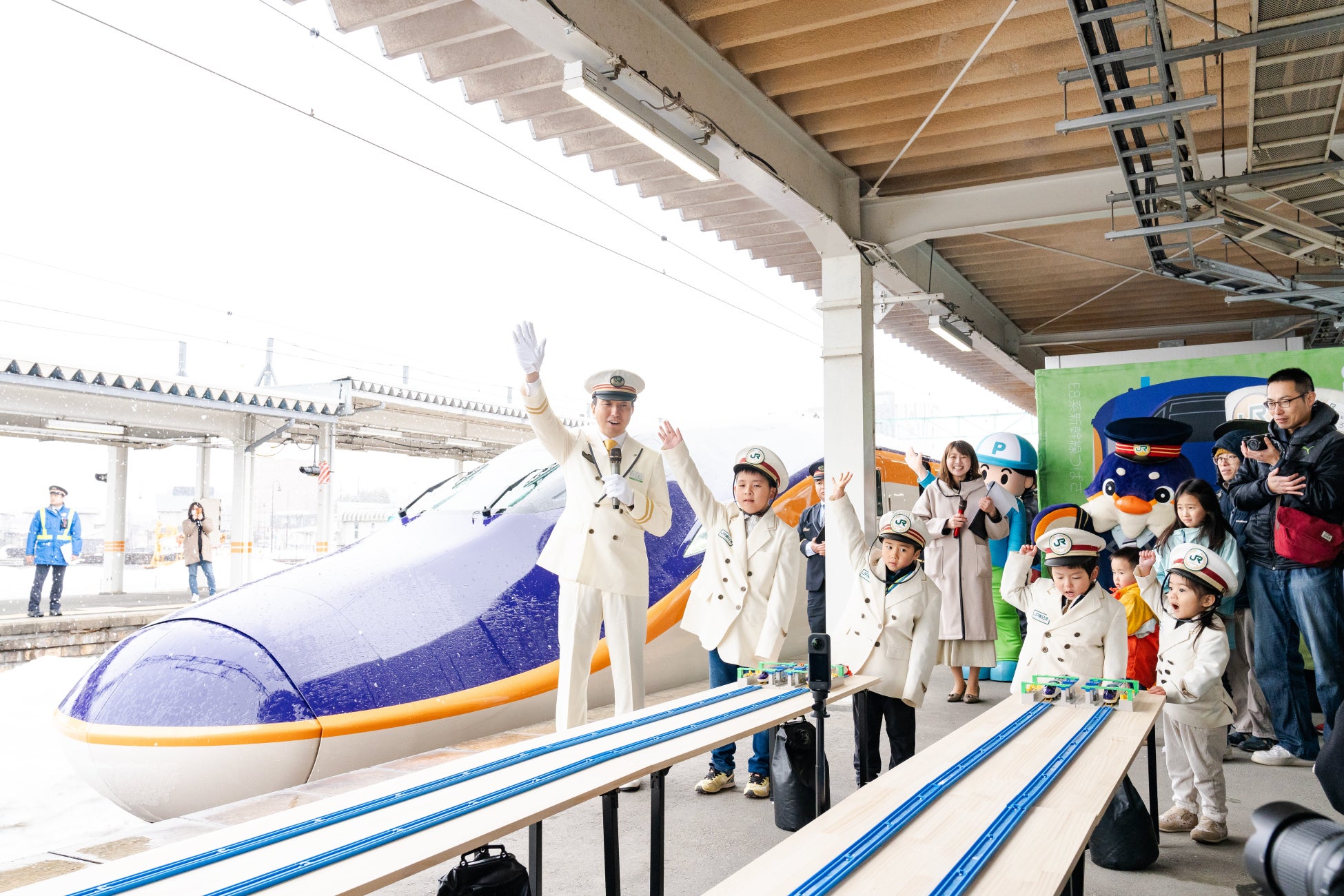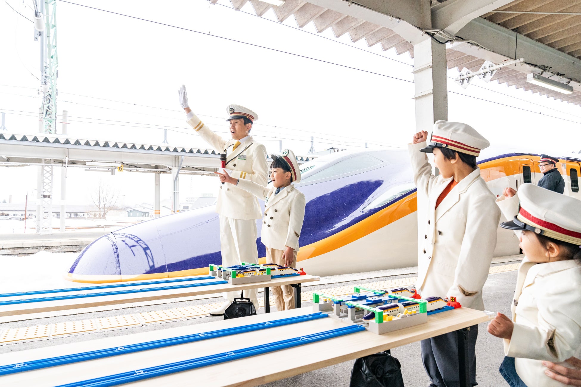 こども駅長には山形県内外から多数の応募があり、抽選で選ばれた8名が「プラレールよねざわえき」の駅長に就任。JR米沢駅長と共に、山形新幹線の発着に合わせて、「しゅっぱつ進行!発車!」と合図をかけ、プラレール「つばさ」のスイッチを入れて、発進する山形新幹線「つばさ」との夢の共演を実現しました。