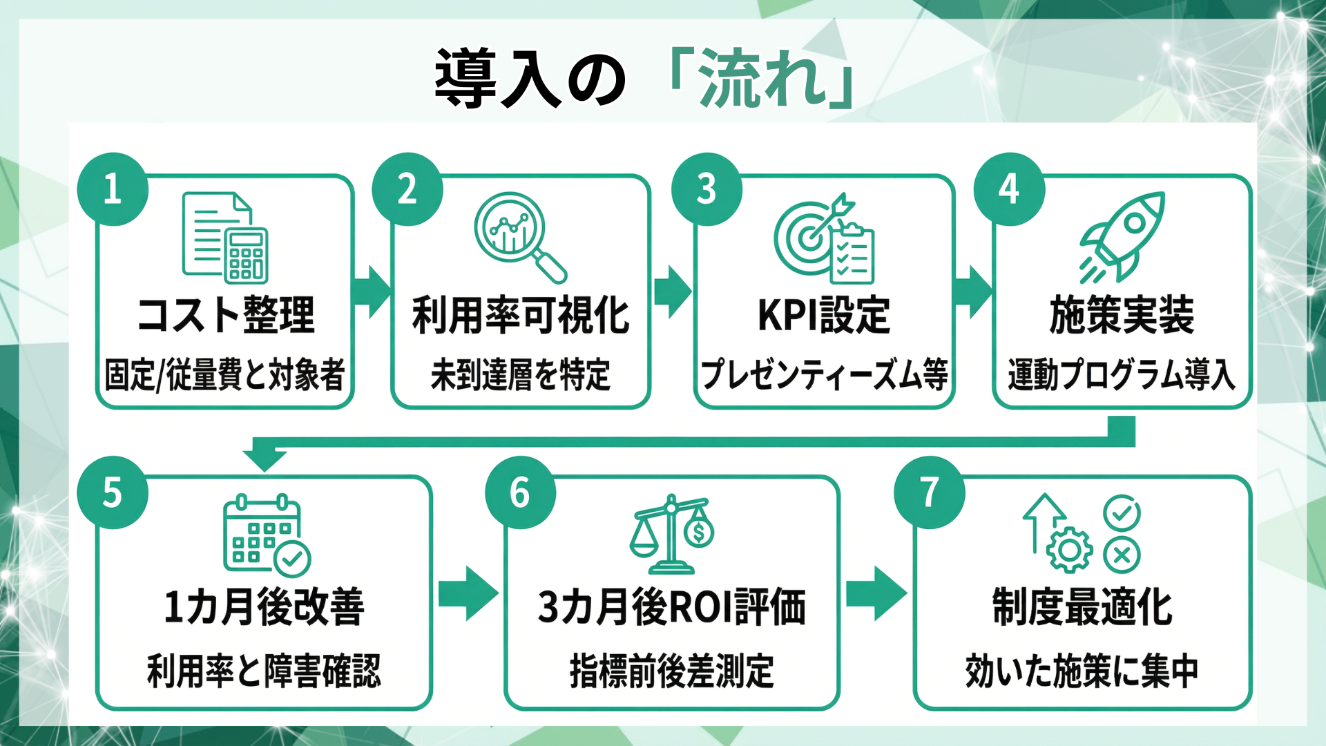 本プログラムは、福利厚生を「入れて終わり」にせず、利用率×変化指標×コストで費用対効果を可視化し、制度改善までを伴走するROI検証支援です。