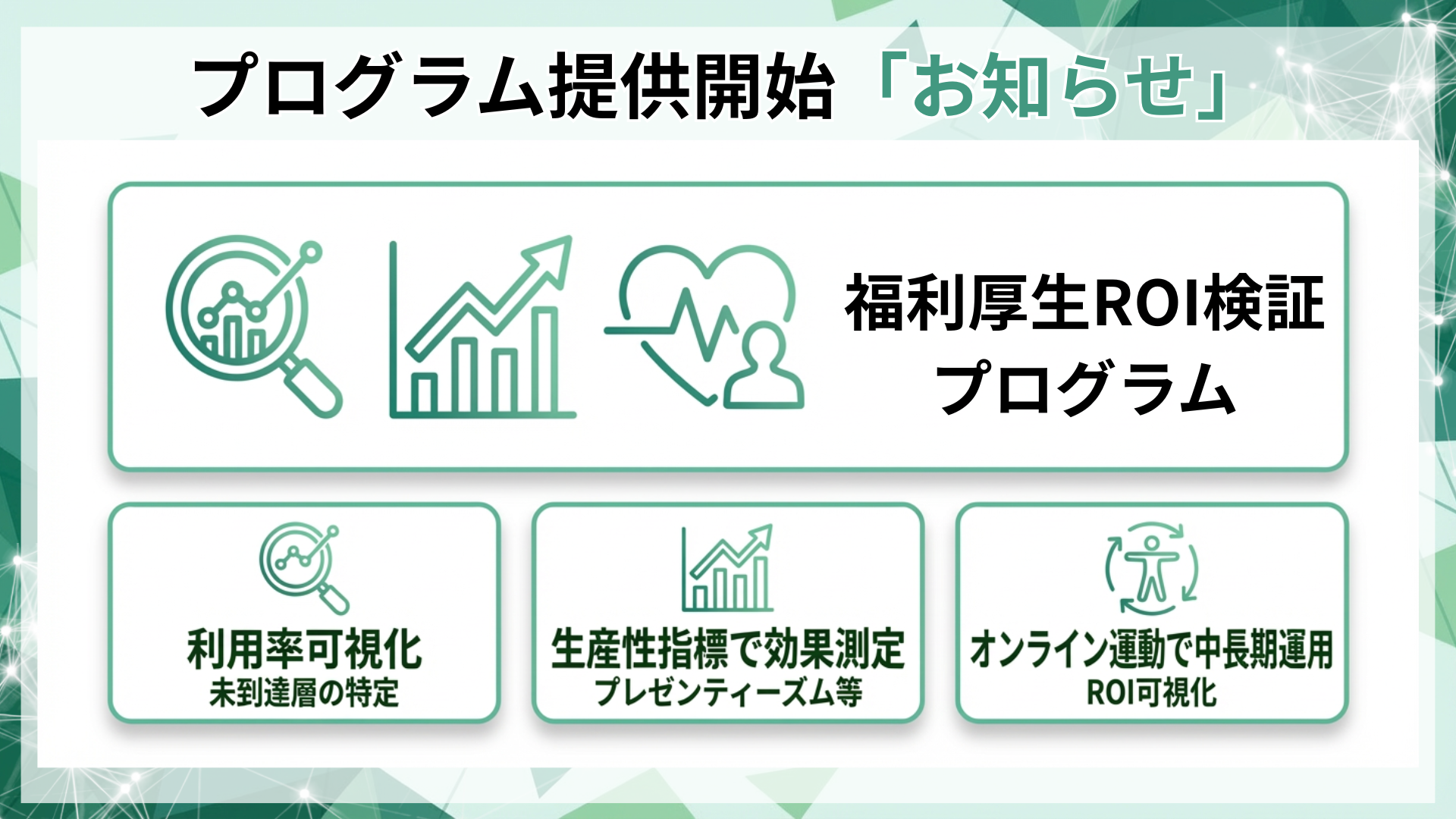 【経営とつなぐ健康経営】福利厚生の効果測定で利用率と生産性を可視化するROI検証プログラム(運動含む)の提供開始