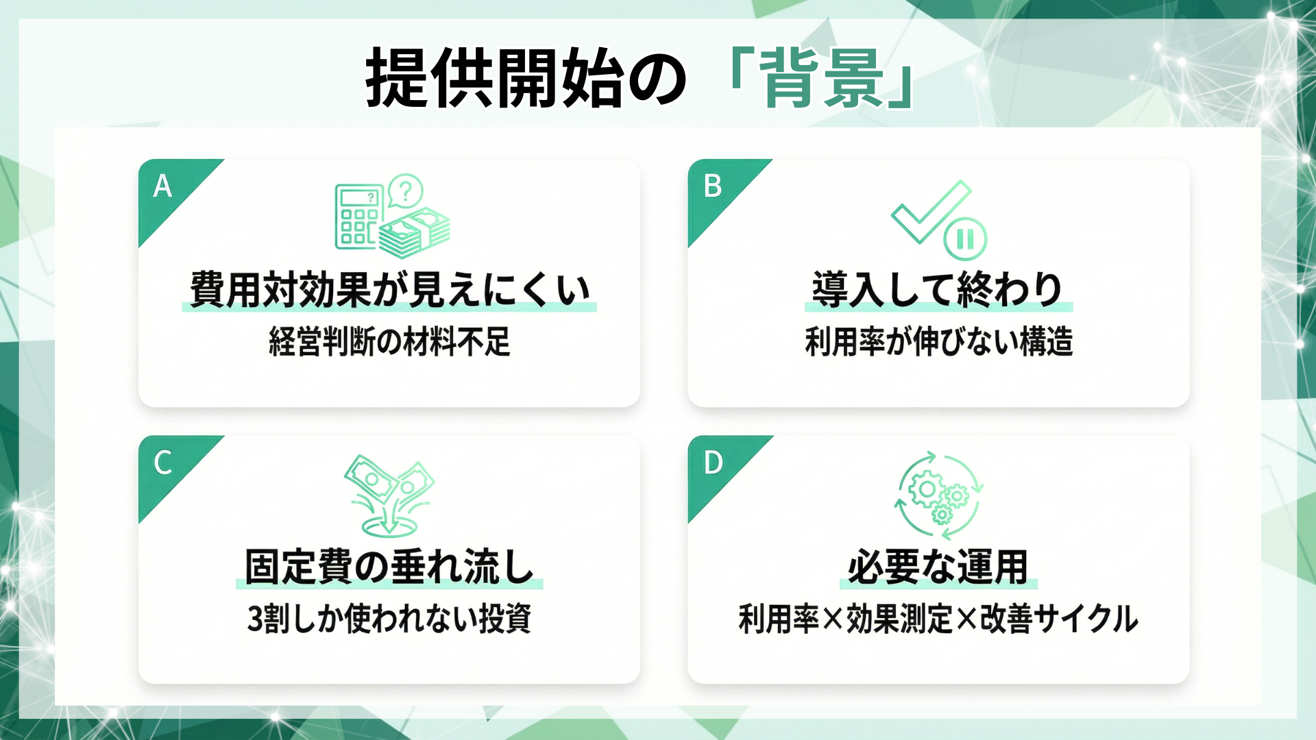 必要なのは、利用率の非合理を可視化し、業務に効く指標で効果測定し、制度改善まで回す運用です。