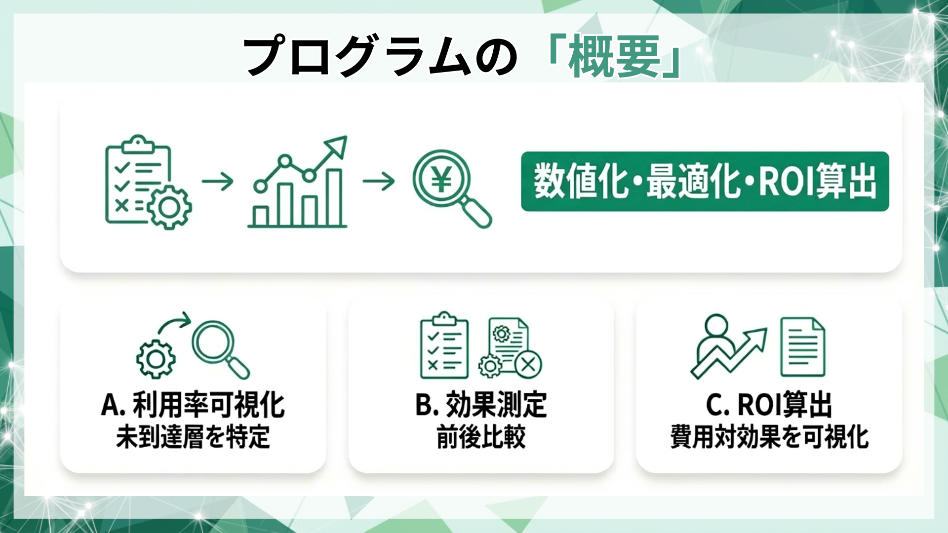 本プログラムは、福利厚生の利用率と効果を数値化し、費用対効果で制度を改善・最適化する測定プログラムです。