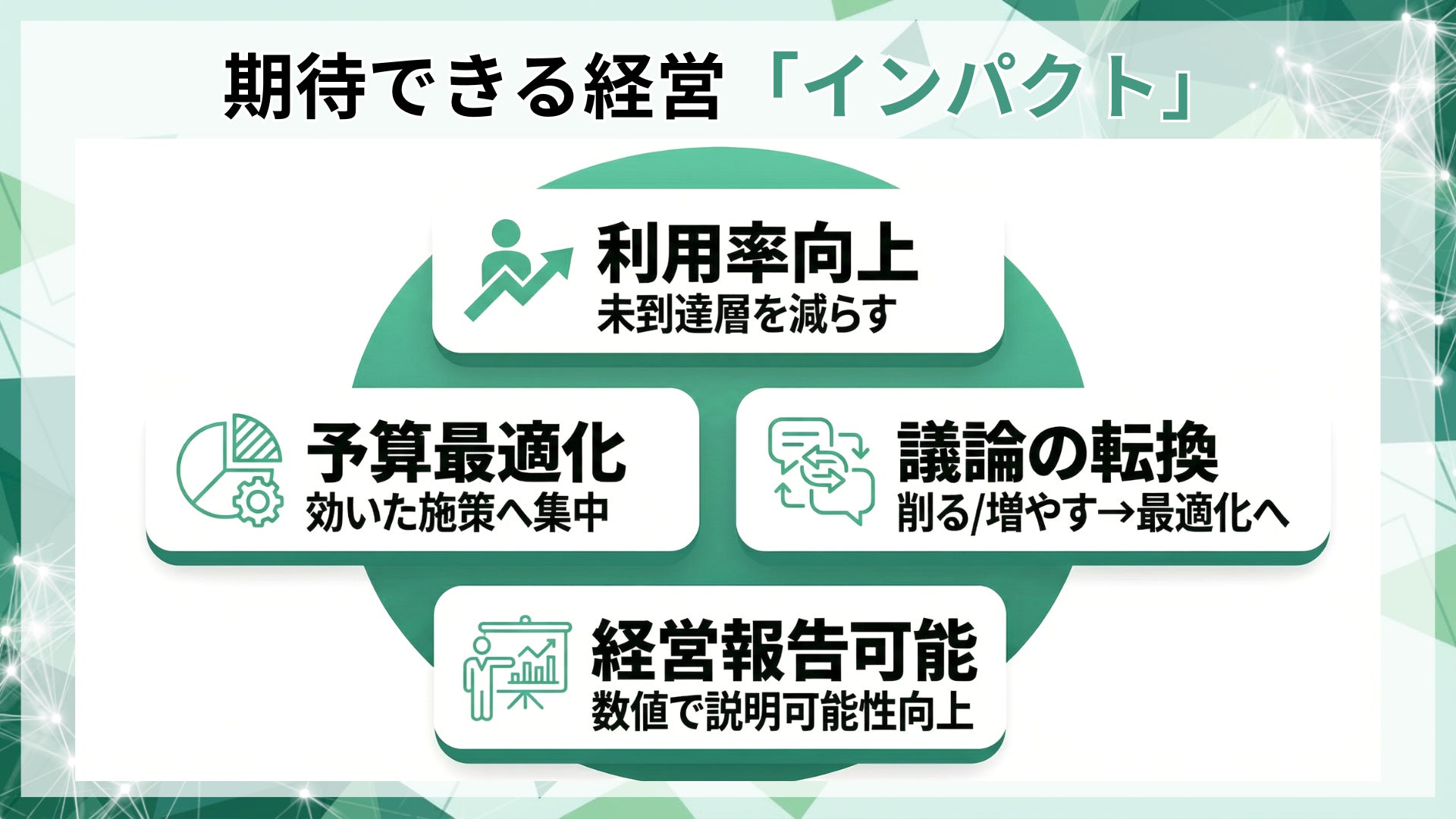 費用対効果を数値で示すことで、制度の意思決定が可能になり、翌期の改定へつながります。