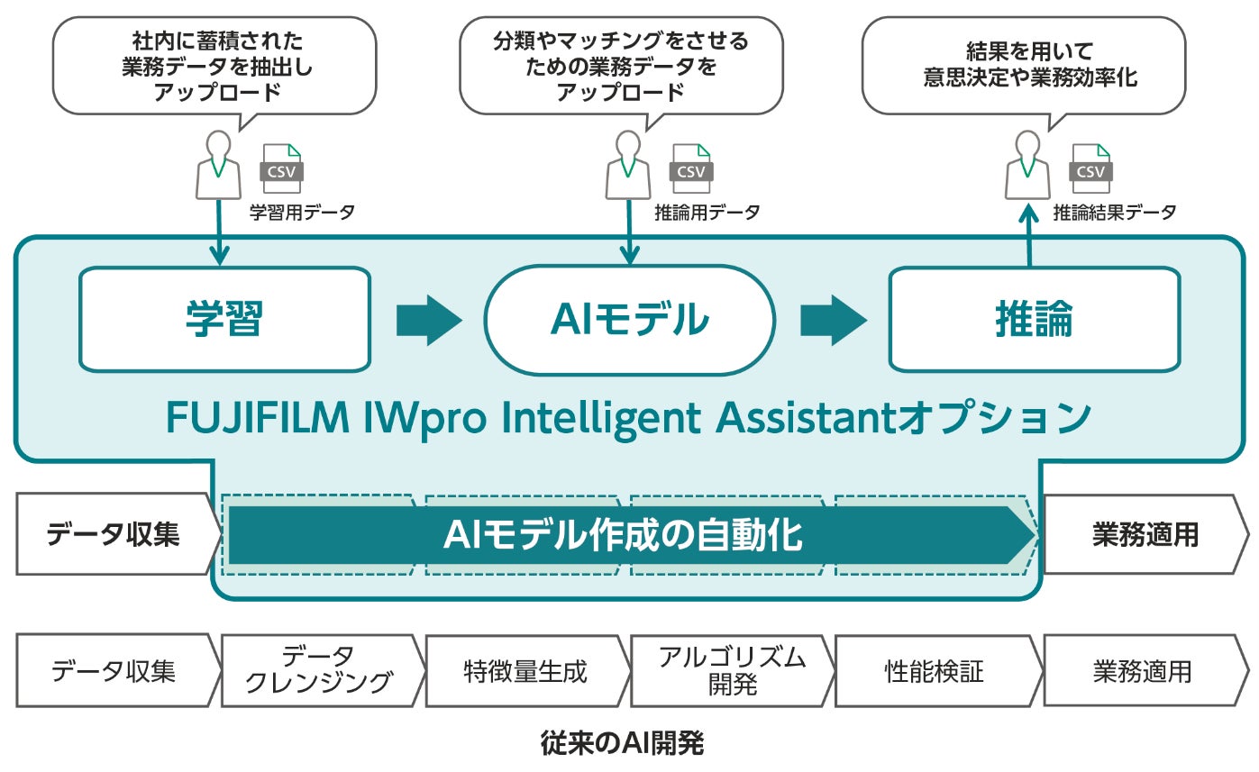 このたび「FUJIFILM IWpro」の新機能として提供する「FUJIFILM IWpro Intelligent Assistantオプション」は、お客様の社内に蓄積された業務データを使って、自社の業務に最適化されたAIモデルを簡単に作成・活用できるサービスです。AIを作成する上で必要不可欠なAIモデル作成工程を自動化し、「FUJIFILM IWpro」のワークスペースとシームレスに連携することで、AIを活用した業務の効率化と迅速な意思決定が図れます。