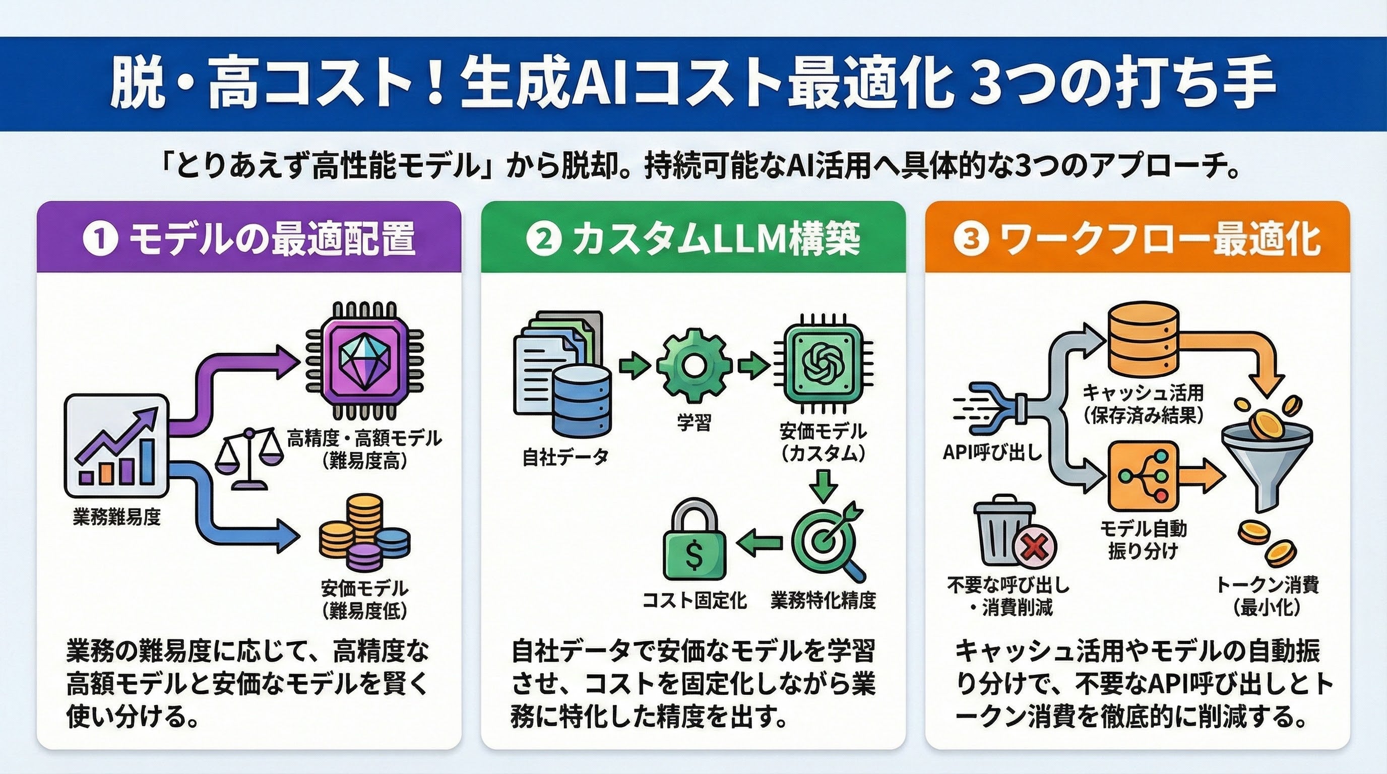 生成AIコストの最適化には、「モデル最適配置設計」「カスタムLLM構築」「AIワークフロー最適化」の3つのアプローチが有効です。モデル最適配置では業務の難易度・精度要件に応じた適切なモデル選定を行い、カスタムLLM構築では自社業務データでファインチューニングを行うことで、従量課金から固定費への移行と精度向上を同時に実現できます。ワークフロー最適化では、Dify等のツールを活用した質問難易度別のモデルルーティングや、キャッシュ戦略による無駄なAPI呼び出しの削減が可能です。
