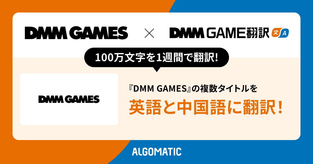 株式会社Algomatic(本社:東京都港区、代表取締役社長:大野 峻典、以下Algomatic)が開発・提供する、独自の翻訳AIを活用したゲーム特化翻訳サービス『DMM GAME翻訳』が、合同会社EXNOA(本社:東京都港区、CEO:村中 悠介)が運営する、国内最大級のPCゲームプラットフォーム『DMM GAMES』の複数タイトルにおいて採用され、英語・中国語(繁体字・簡体字)の3言語に翻訳しました。約100万字の翻訳を約1週間で完了することで、従来と比べて約13倍のスピードでの納品を実現するとともに、コストおよび現場の業務負荷の大幅削減に寄与しました。