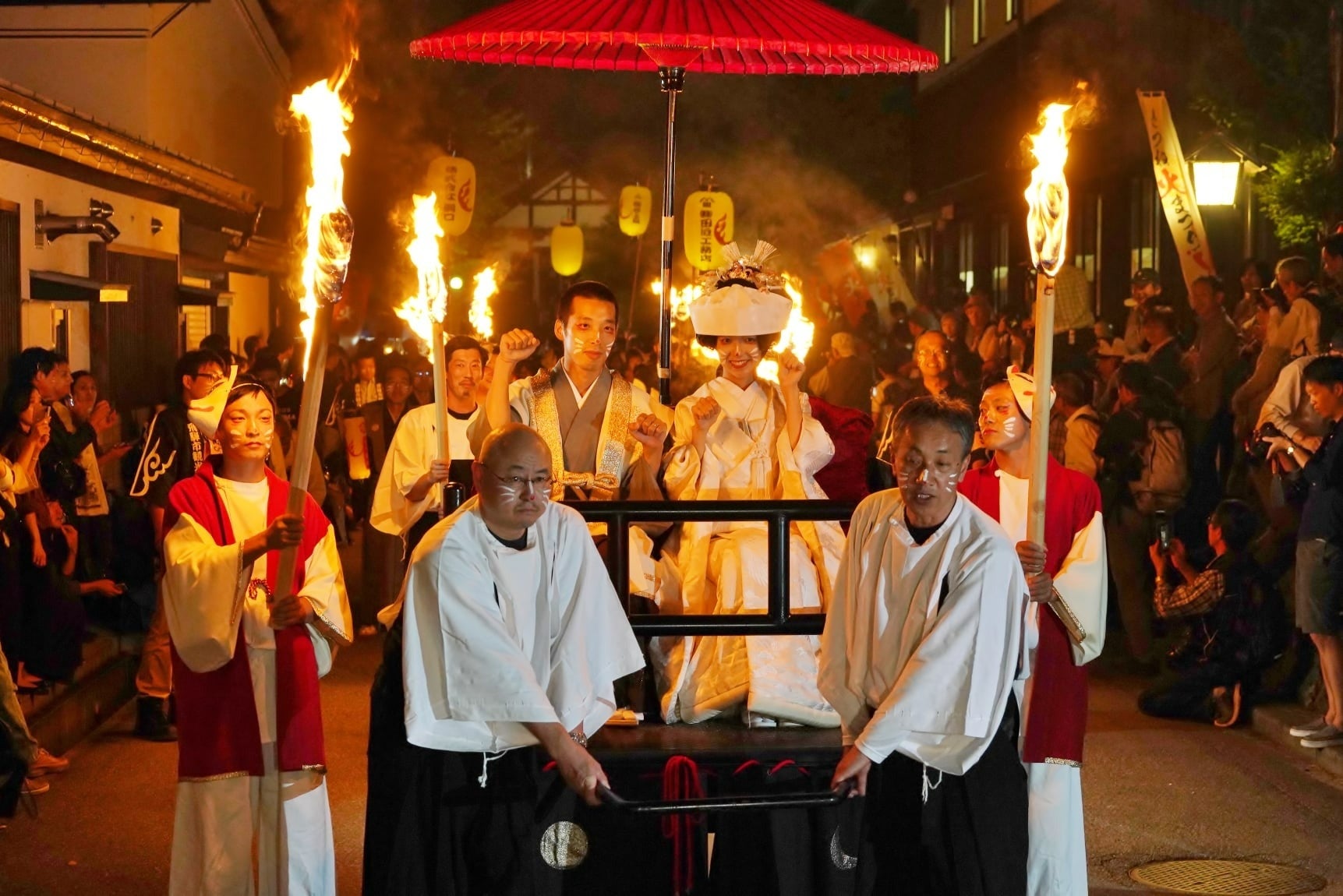 最大の見どころは夜の「嫁入り行列」です。人力車に乗った花嫁花婿を中心に、松明を灯した狐の行列が古い町並みを練り歩き、その光景は奥ゆかしく幻想的でおとぎ話のよう。