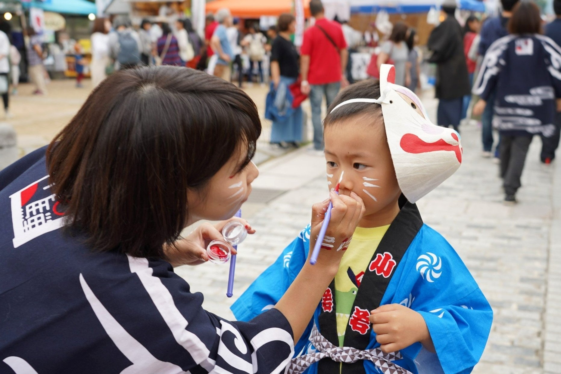 地元住民も観光客も誰でも狐メイクや仮装をして祭りに参加できます。(まつり広場で狐メイク無料)