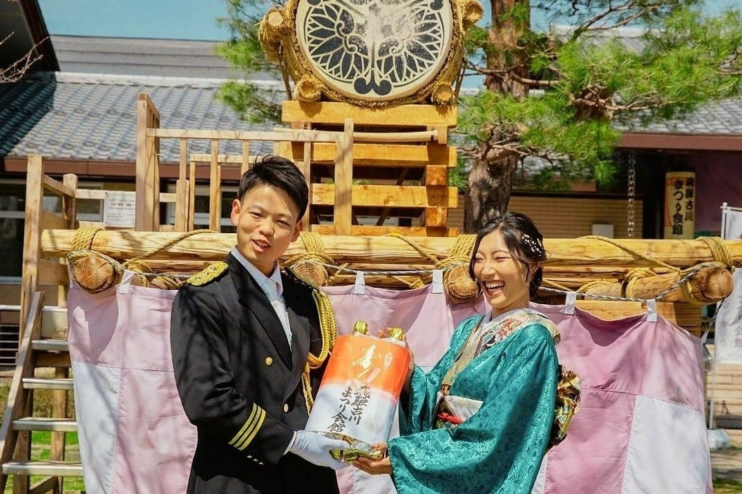 小栗さん夫婦は「飛騨古川は思い入れの強い場所です。そのきっかけは、2022年によさこいダンスチーム「半布里」(飛騨市観光プロモーション大使)で、古川祭をテーマに「日本ど真ん中祭り」(名古屋市)で頂点に立ったことです。昨年は古川祭を生で見学しました。町の雰囲気、住民の皆さんの温かさ、そして皆さんが古川祭を守るために尽力されている姿、すべてが古川愛に溢れていました。昨年10月に入籍し、4月に古川でウェディングフォトを撮らせていただきました。天候と桜にも恵まれ、側を通られる方にお祝いしていただきとても幸せでした。いつも温かく迎えてくれる飛騨古川の皆さんと、そして飛騨古川と巡り会えたご縁に感謝の気持ちを込めて応募させていただきました。」と話しています。