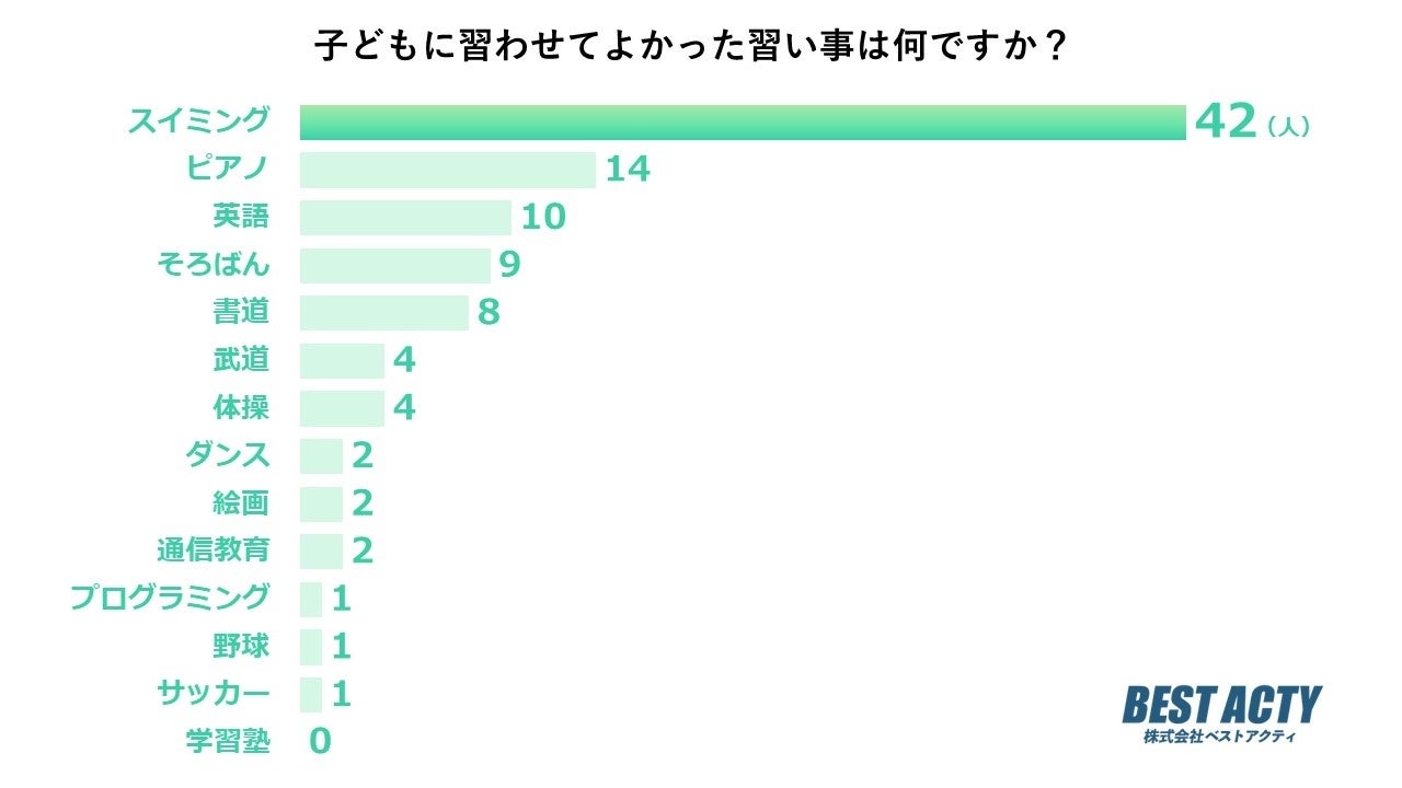 子どもに習わせてよかった習い事について100人にアンケートを行ったところ、「スイミング」と回答する人が最も多い結果となりました。