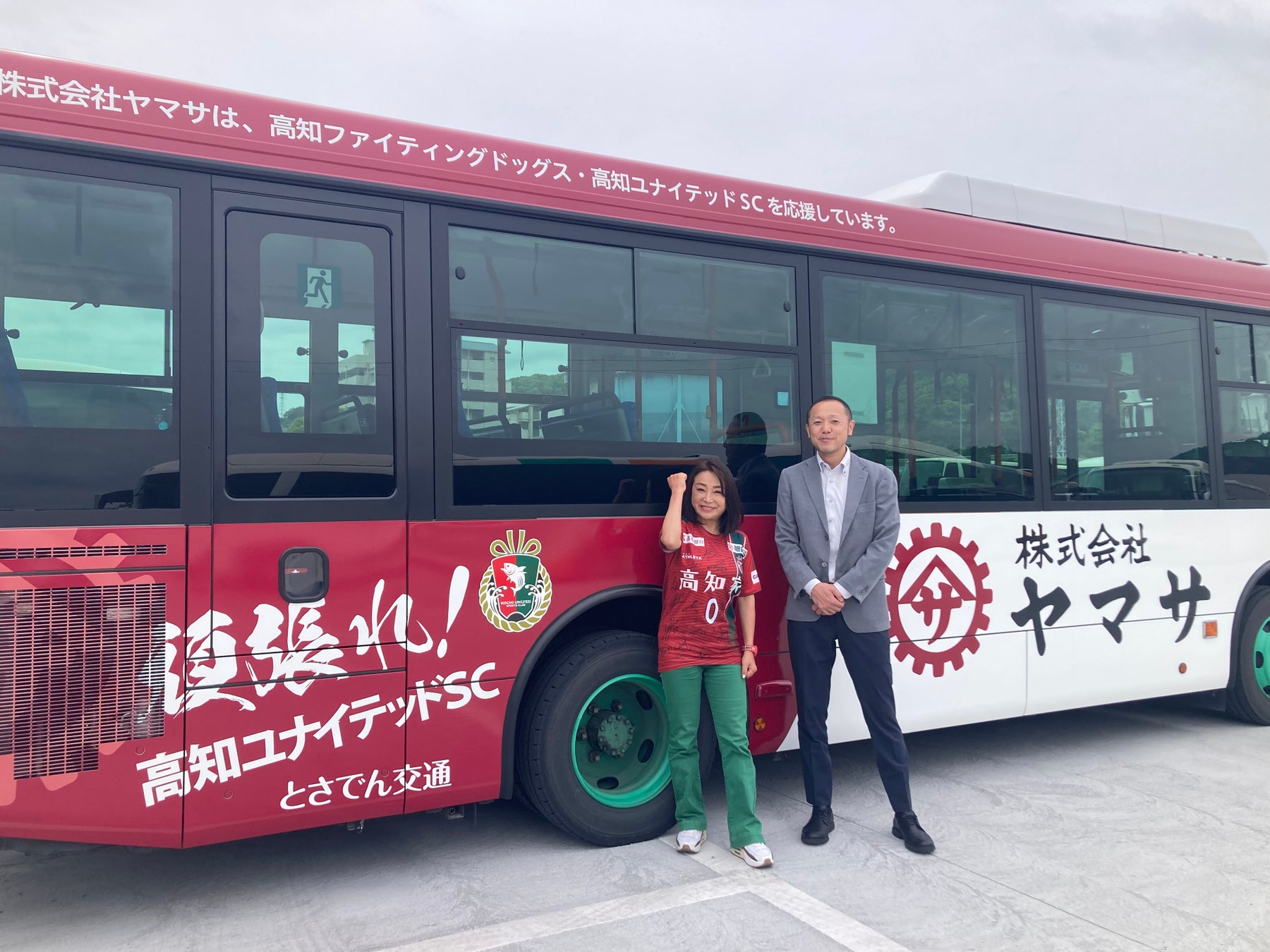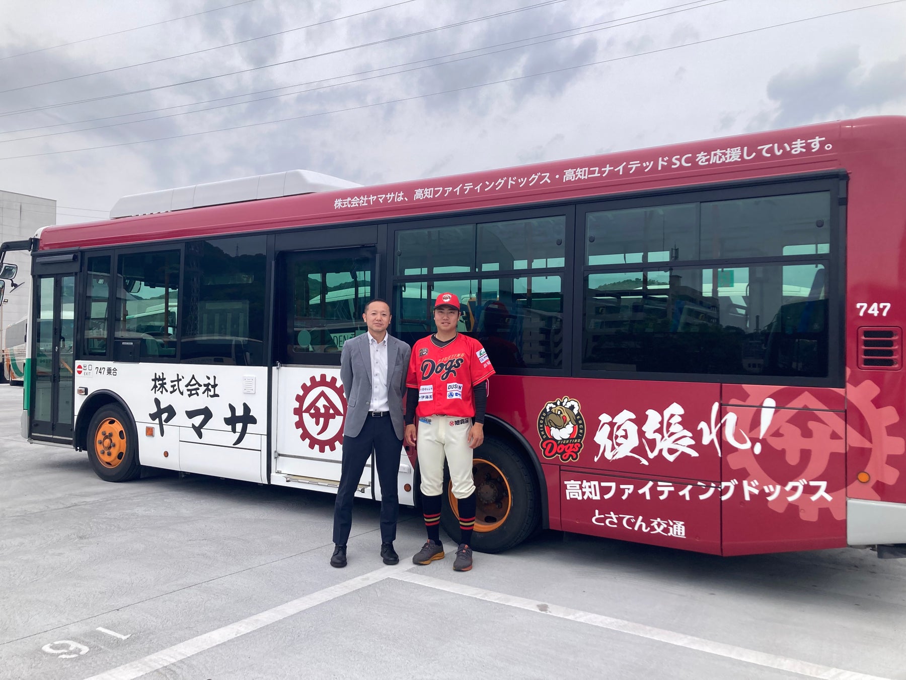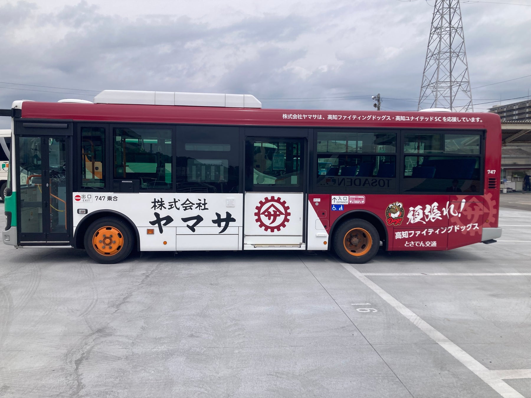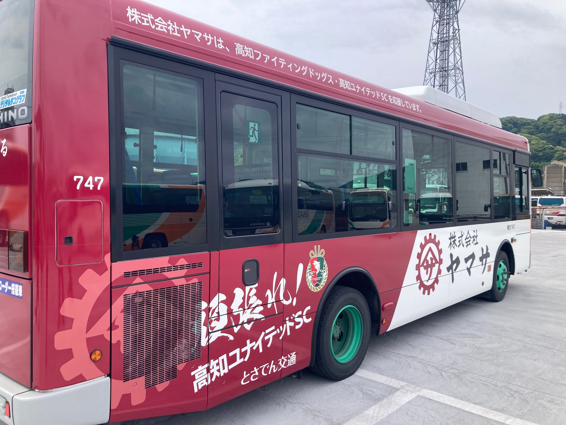 ヤマサは、2025年5月1日から高知県を盛り上げるラッピングバスの運行を開始しました。ラッピングバスは、ヤマサのコーポレートカラーであるえんじ色を基調に、高知県のスポーツチームでありヤマサがスポンサーとなっている「高知ファイティングドッグス」と「高知ユナイテッドSC」のロゴマークを打ち出しております。