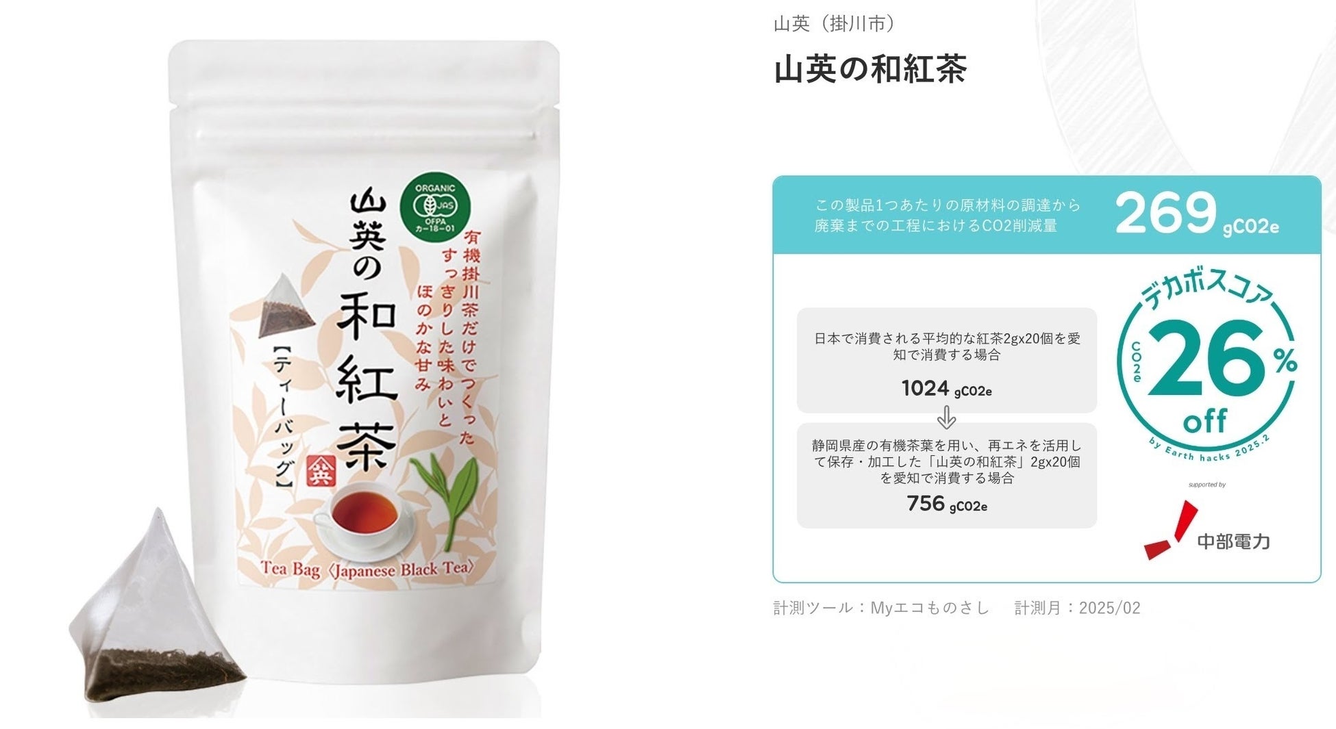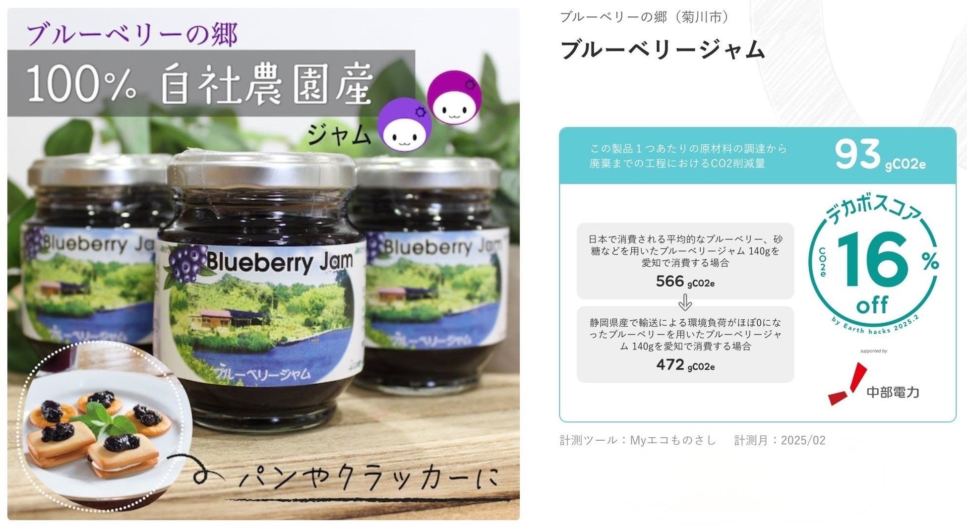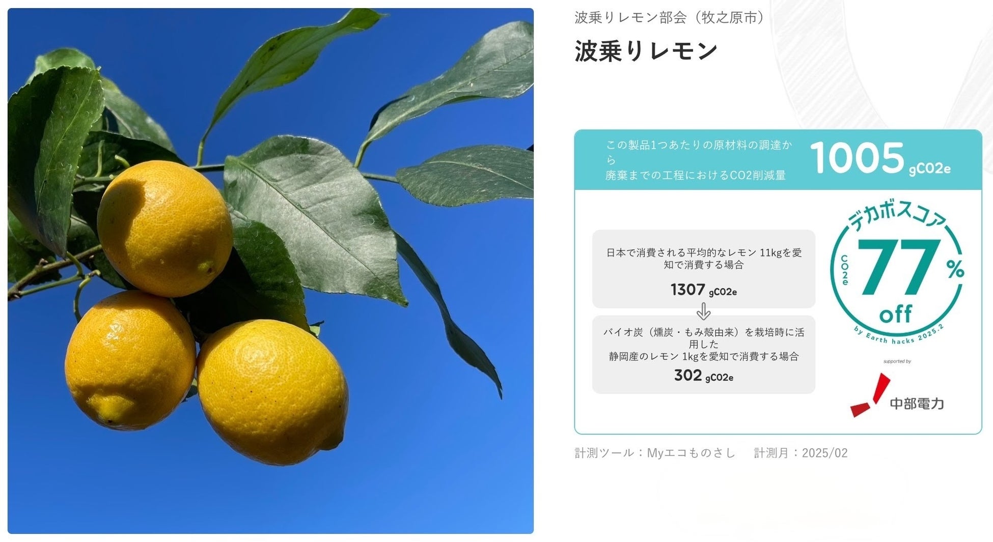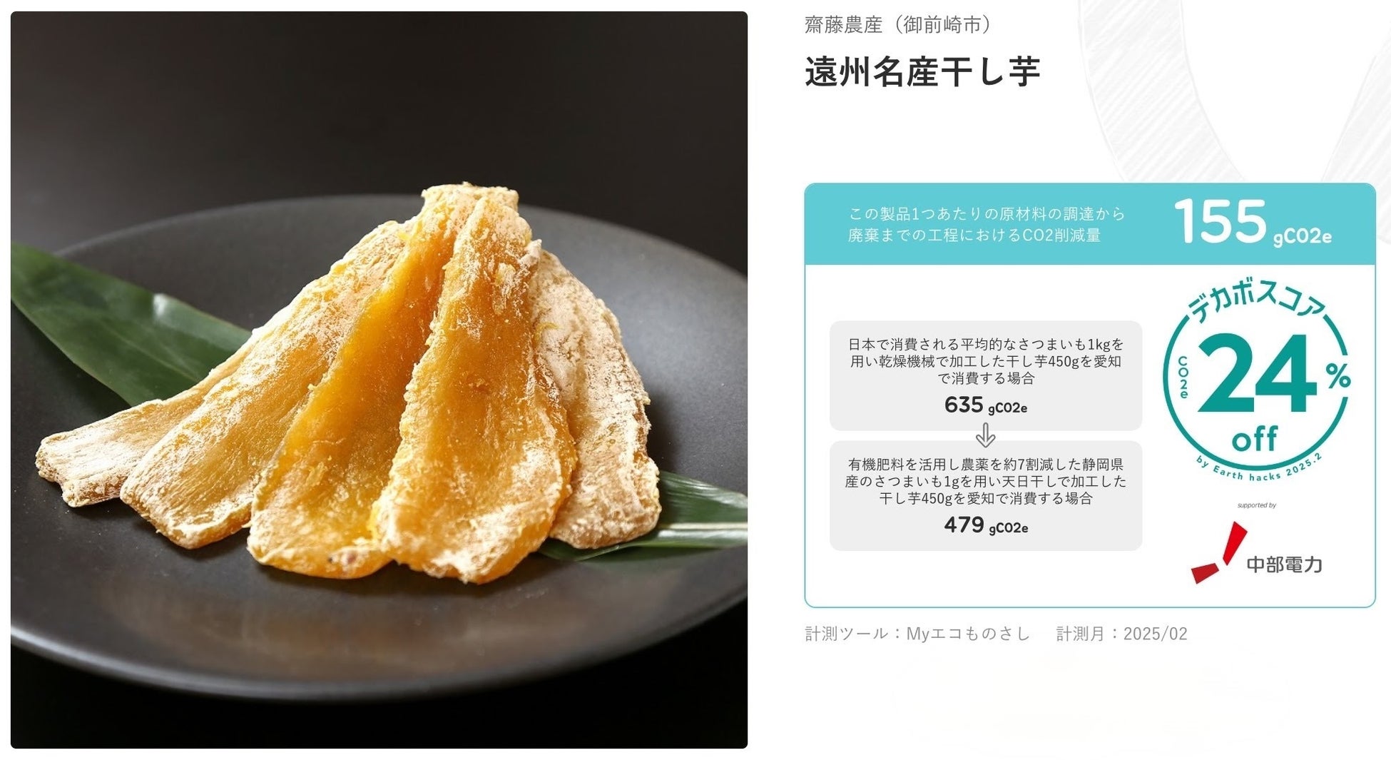 各地域の特産品のCO2排出量の削減率を示す「デカボスコア」を表示します。