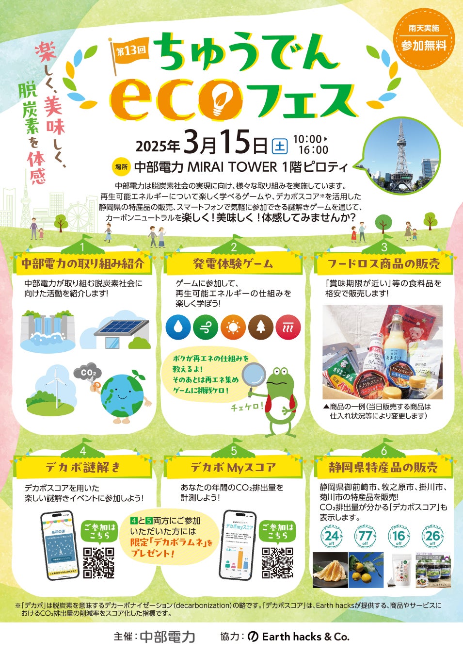 生活者の声をもとに、脱炭素関連商品・サービスや事業の開発を目指す生活者共創型プラットフォームを展開するEarth hacks株式会社(本社:東京都渋谷区、代表取締役社長:関根澄人、以下「Earth hacks」)は、中部電力株式会社と共に、来場者の環境意識向上を目指したイベント「第13回 ちゅうでんecoフェス ~楽しく、美味しく、脱炭素を体感~」を2025年3月15日(土)に中部電力 MIRAI TOWER 1階ピロティにて開催いたします。