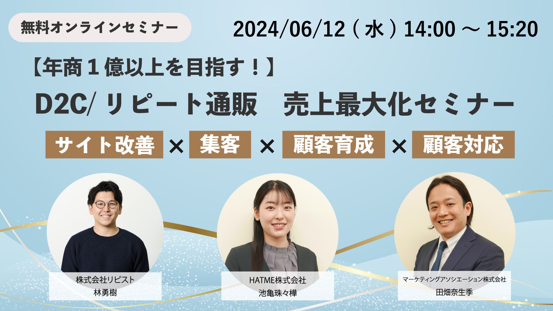 ECサイトの運営代行サービスを提供しているマーケティングアソシエーション株式会社(本社:東京都台東区 代表取締役:中園広和、以下当社)は、2024年6月12日(水)に、ウェブセミナー「【年商1億以上を目指す!】 D2C/リピート通販 売上最大化セミナー ~サイト改善×集客×顧客育成×顧客対応~」を、株式会社リピスト、HATME株式会社と共催いたします。