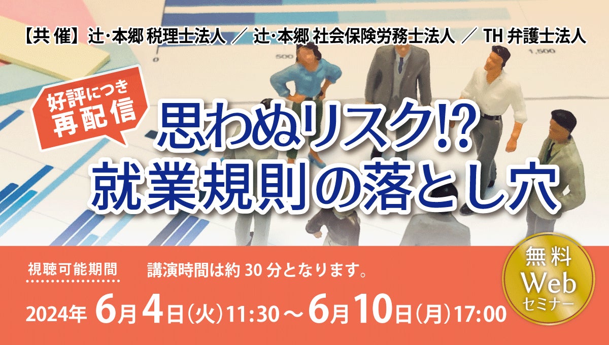 辻・本郷 税理士法人(本社:東京都新宿区、理事長:徳田孝司)と、辻・本郷 社会保険労務士法人(本社:東京都新宿区、代表社員:髙橋紀行)及びTH弁護士法人(本社:東京都新宿区、代表社員:新井健一郎)は、2023年10月に3社共催で開催しご好評いただいた「思わぬリスク⁉ 就業規則の落とし穴」セミナーの再配信を決定いたしました。本セミナーでは、法律と自社の実情に即した企業防衛型の就業規則を作成するためのポイントをわかりやすく解説します。また、就業規則を整備していないためにおこるリスク等について、事例を交えて説明します。