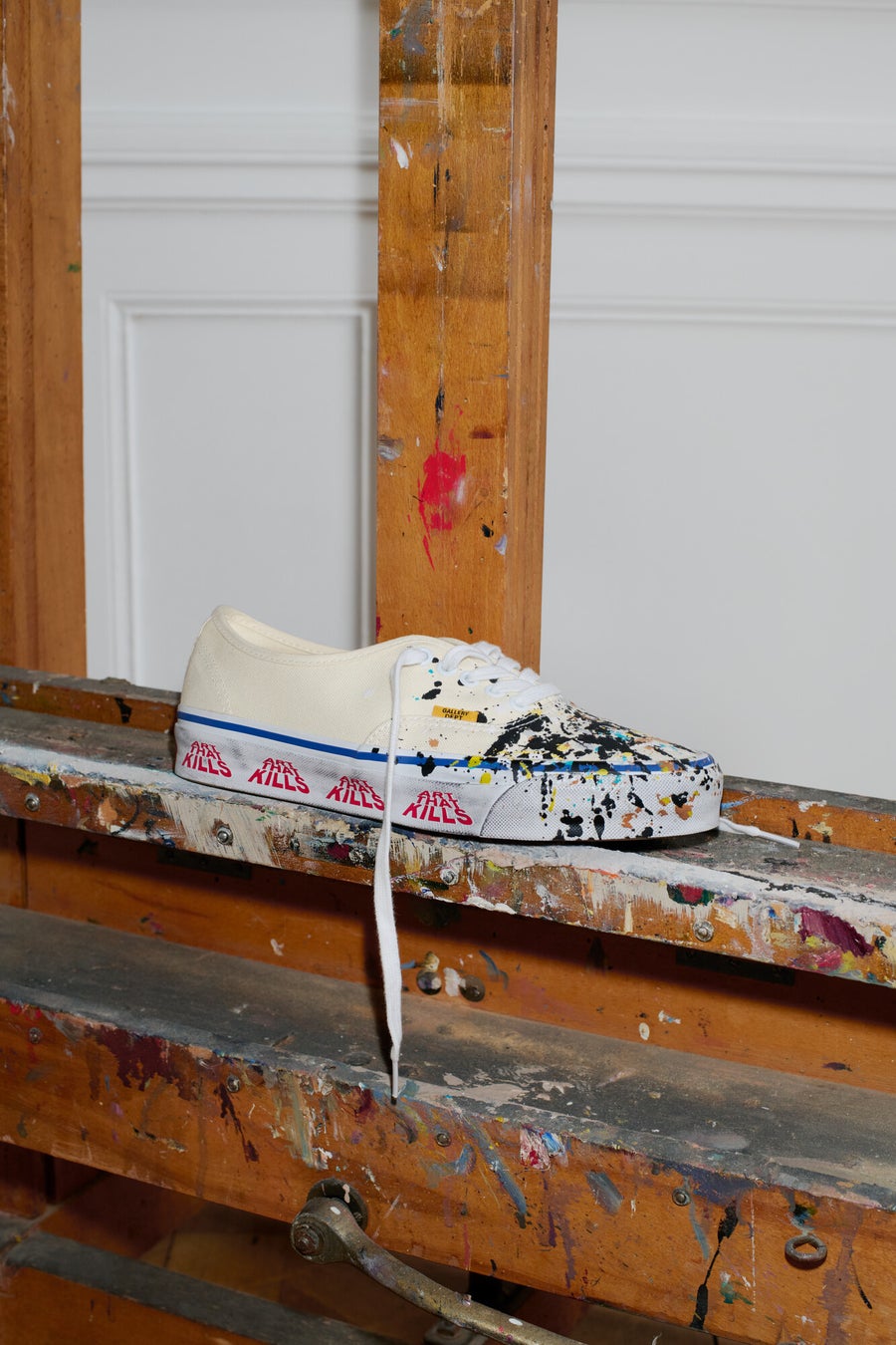 トゥ部分に広がるペイントのしずくや、 バンプとサイドウォールに施された丁寧に施されたユーズド加工が、独特の深みと質感を演出しています。サイドウォールに刻まれた「Art That Kills」というGallery Dept.のスローガンは、妥協を許さない芸術表現の本質と力強さを象徴しています。