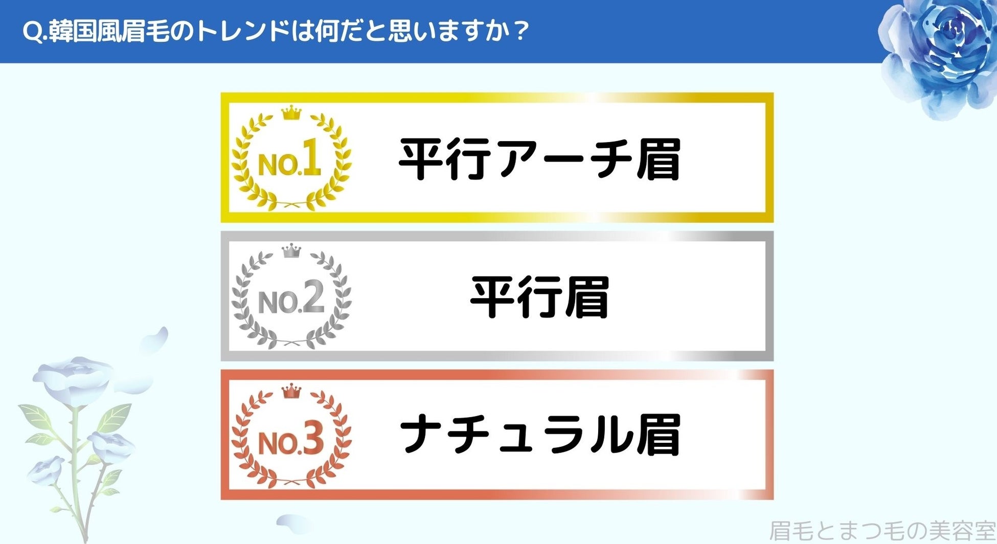 韓国風眉毛のトレンドをお聞きしたところ「1位>平行アーチ眉」、「2位>平行眉」、「3位>ナチュラル眉」という結果になりました。