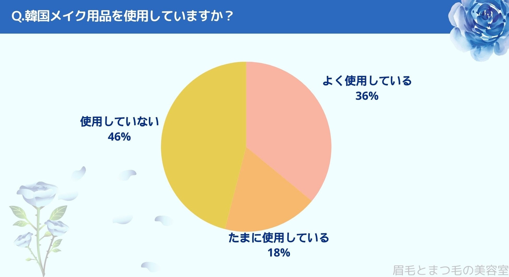 韓国メイク用品を使用しているかお聞きしたところ「よく使用している(36%)」、「たまに使用している(18%)」、「使用していない(46%)」という結果になりました。