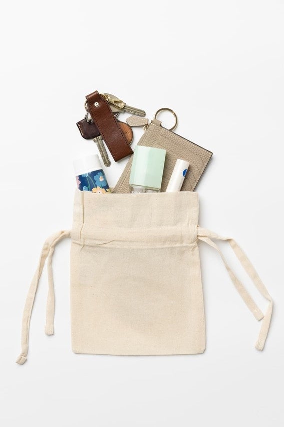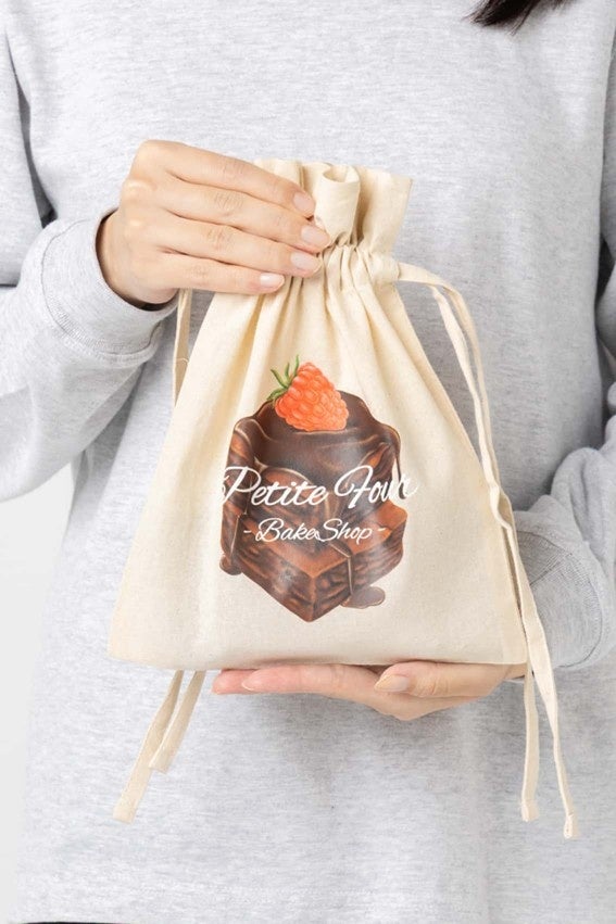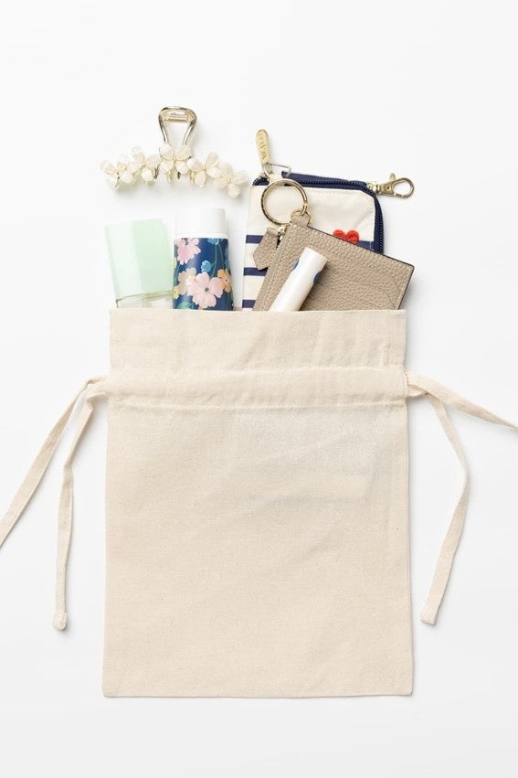 オーガニックコットン100%を使用した、やさしい風合いの巾着。平らなひもは蝶結びにするとアクセントになり、ギフトラッピングにもおすすめです。環境関連イベントのグッズやノベルティ、小物入れとして幅広く活躍。手間と時間をかけて大切に育てられた綿花から作られた、サステナブルなアイテムです。