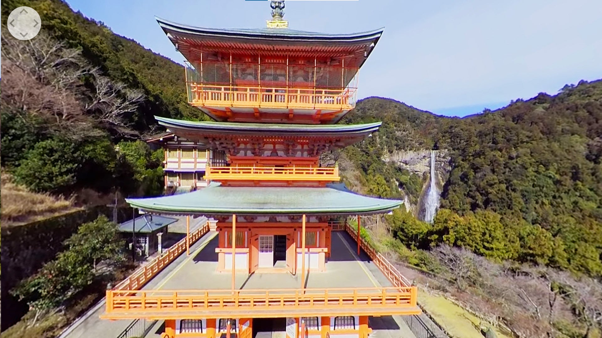 熊野那智大社に隣接するのは、那智山青岸渡寺。神社仏閣が隣接する様子に神仏習合という熊野独自の信仰の姿を観ることができます。その他、三重塔や那智の滝などの名所をドローン映像も含めて紹介。空からの眺望も楽しめるのはVR観光ならではの体験といえるでしょう。