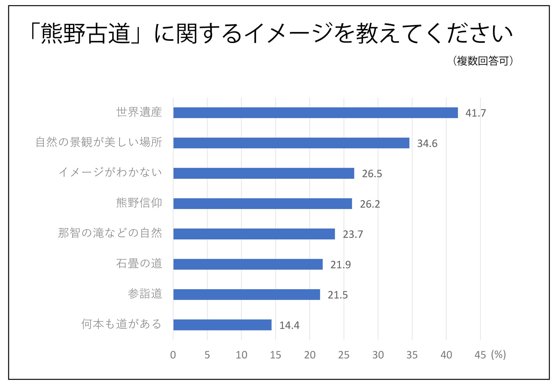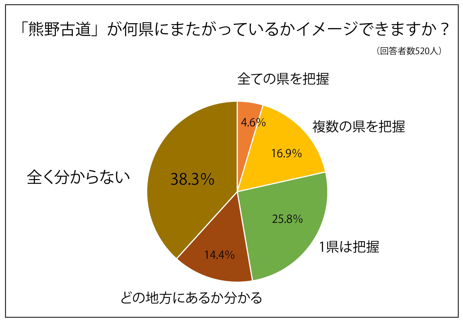 加えて、「熊野古道は何県にまたがるか」という質問に関して、「全く分からない」と答えた人が38%を占めるなど所在が知られていない実態がうかがえます。