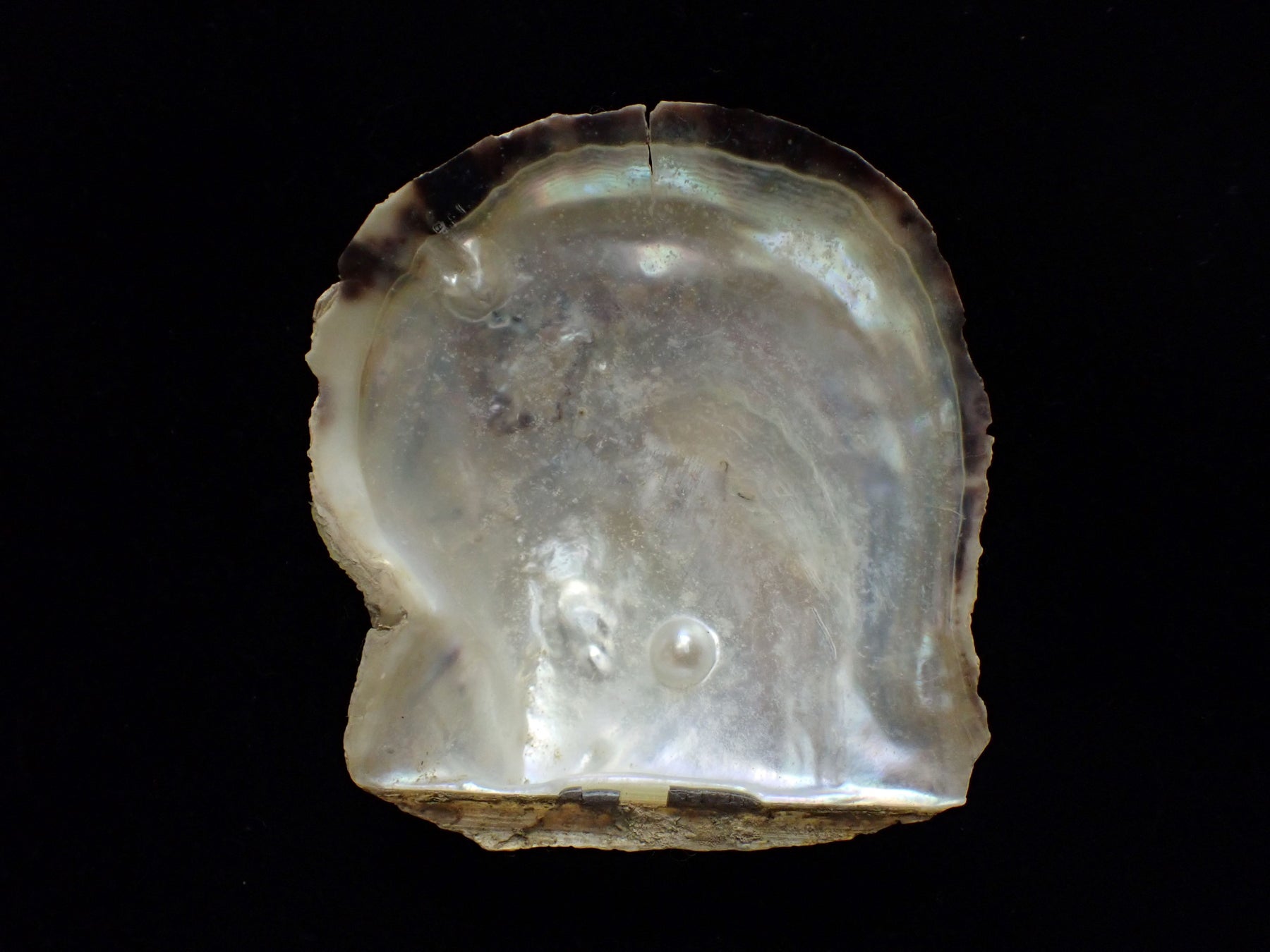 真珠養殖は1887(明治20)年頃に東京大学理学部動物学教室の箕作佳吉らが研究を始めました。その後、鳥羽の御木本幸吉が箕作から助言を受けて真珠養殖の技術開発に取り組み、1893(明治26)年にまず半円の真珠(アコヤガイの殻の内側に張り付いた状態の真珠)の作成に成功します。その後、箕作の教え子で御木本の娘婿となった西川藤吉が真円真珠養殖の基礎技術を確立しました。(所蔵:東京大学大学院理学系研究科附属三崎臨海実験所)