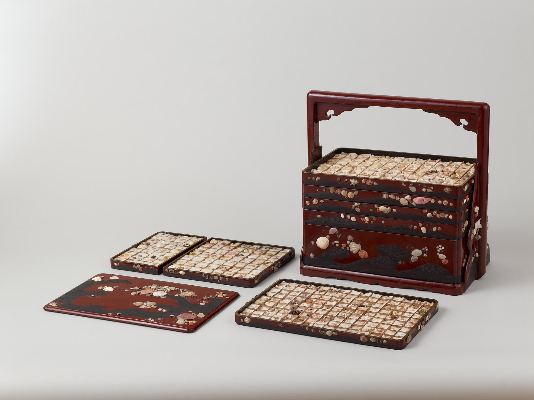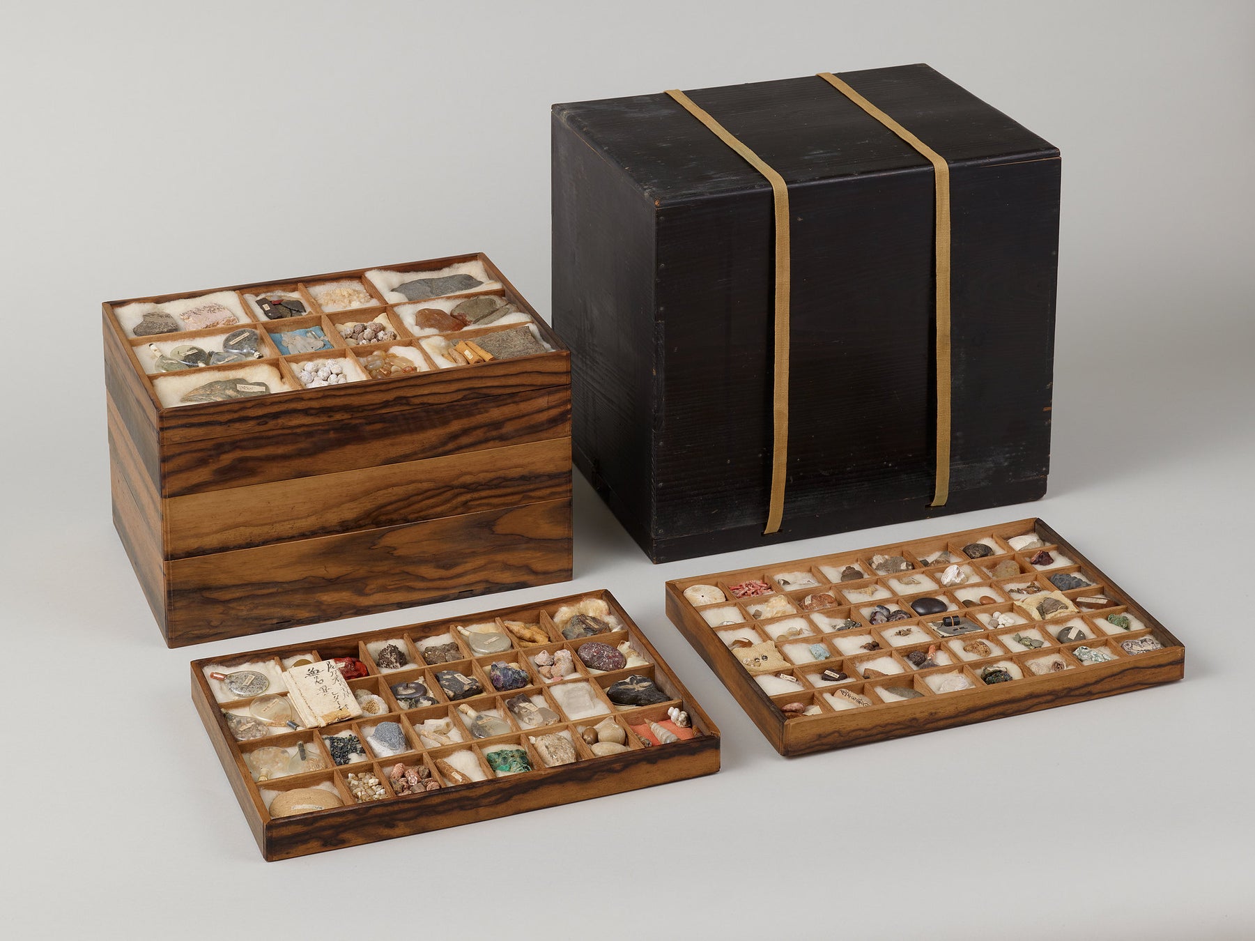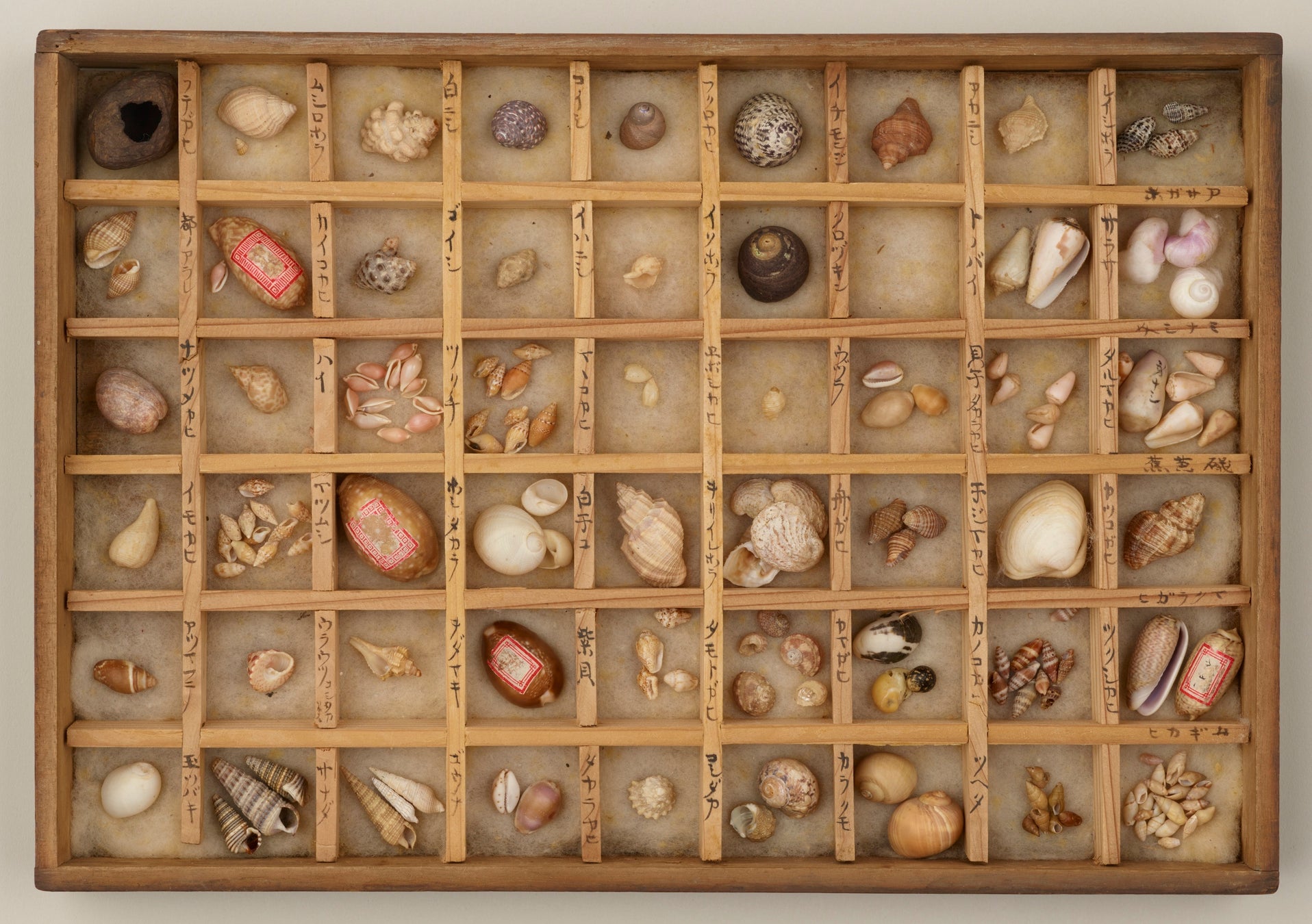 幕末・明治の大阪に生きた博物家・堀田龍之助が所蔵していた貝類標本です。堀田は商家の生まれで、本草学者の畔田翠山や山本榕室と交流があり、多くの博物画や書籍を所蔵していました。貝類標本を収めた重箱の仕切りには種名が書かれており、本草学における貝類の分類や研究の手法を類推できる貴重な資料です。