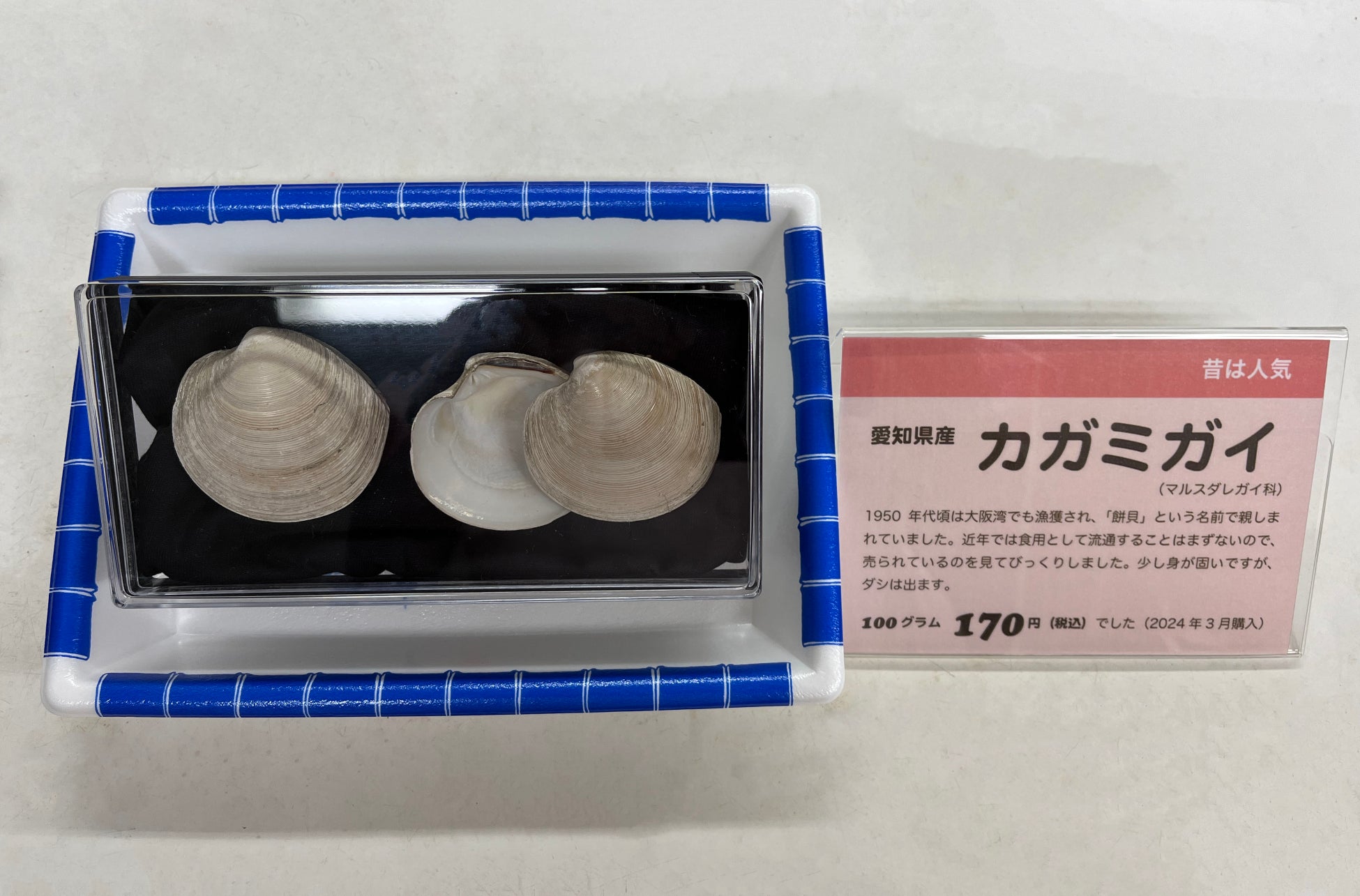 大阪だと食材として買い求める貝はアサリ、シジミ、ホタテといったところですが、スーパーで注意深く見ていると変わった貝に出会うことがあります。鮮魚コーナーは貝類学の入口です。写真は2024(令和6)年に大阪市内のスーパーで売られていた愛知県産カガミガイ。