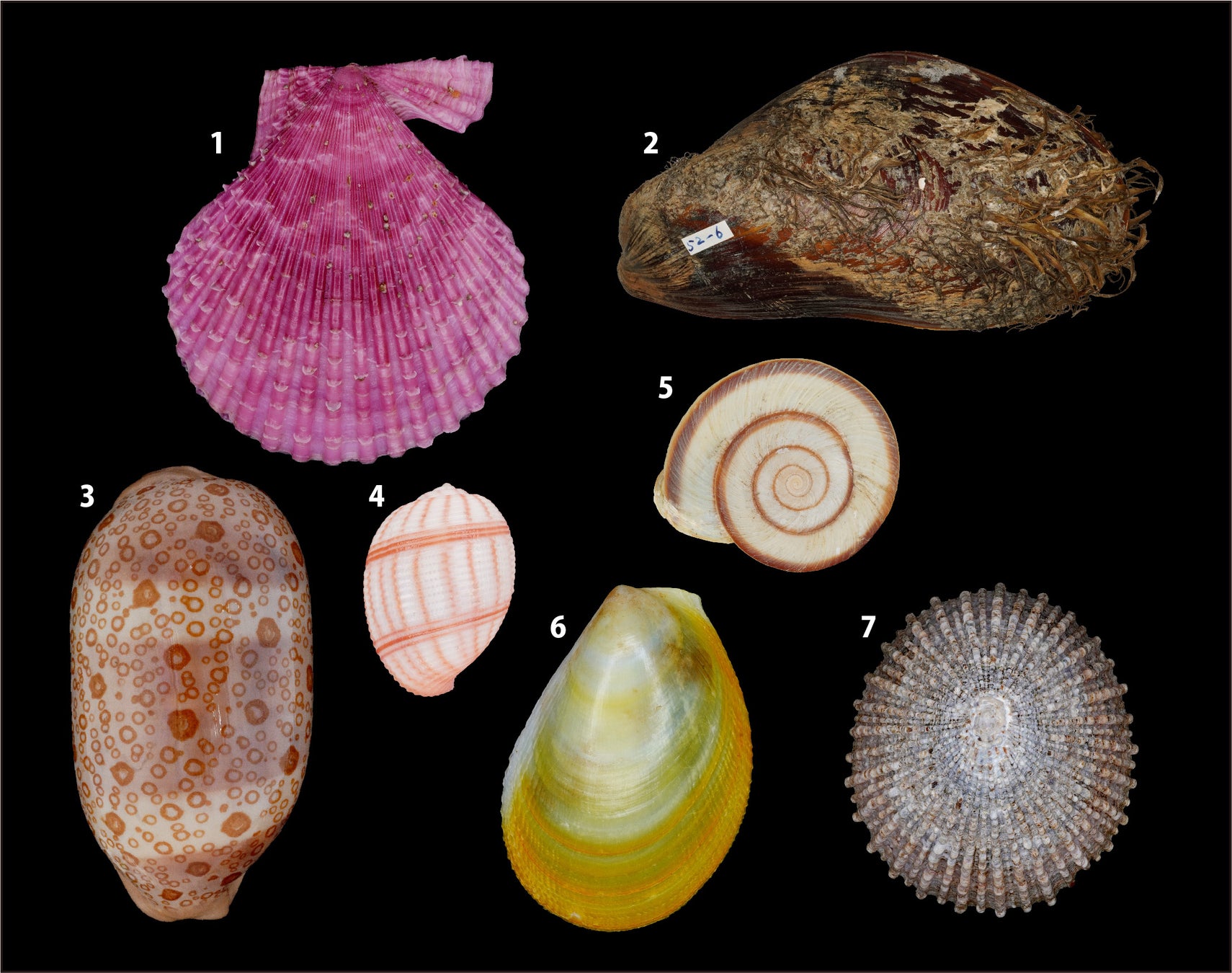 日本列島のどこに、どんな貝がいるのか? ある地域に生息する貝類のリストを貝類相と言いますが、日本の貝類相を明らかにするうえで、各地のアマチュアによる標本の収集活動が大きく貢献しています。大阪市立自然史博物館が今までに寄贈を受けたコレクションにより、日本の貝類相を概観します。1:ヒオウギガイ(島根県西ノ島町・養殖)、2:エゾヒバリガイ(北海道稚内市)、3:ジャノメダカラ(沖縄県)、4:オオベニシボリ(相模湾)、5:ムラヤママイマイ(新潟県糸魚川市明星山)、6:ミカンオオハネガイ(千葉県館山市沖)、7:カサガイ(東京都小笠原村母島)。