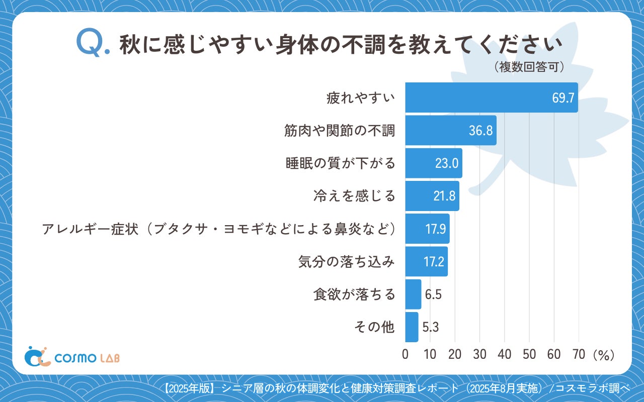 「疲れやすい」(69.7%)が圧倒的多数で、「筋肉や関節の不調」(36.8%)、「睡眠の質が下がる」(23.0%)、「冷えを感じる」(21.8%)が続きます。「アレルギー症状(ブタクサ・ヨモギなどによる鼻炎など)」(17.9%)や、「気分の落ち込み」(17.2%)も一定数見られます。疲労感を7割近くが経験している結果は、秋の気温変化や湿度低下、日照時間の短縮などが身体の恒常性維持機能に負担をかけていることを示しています。