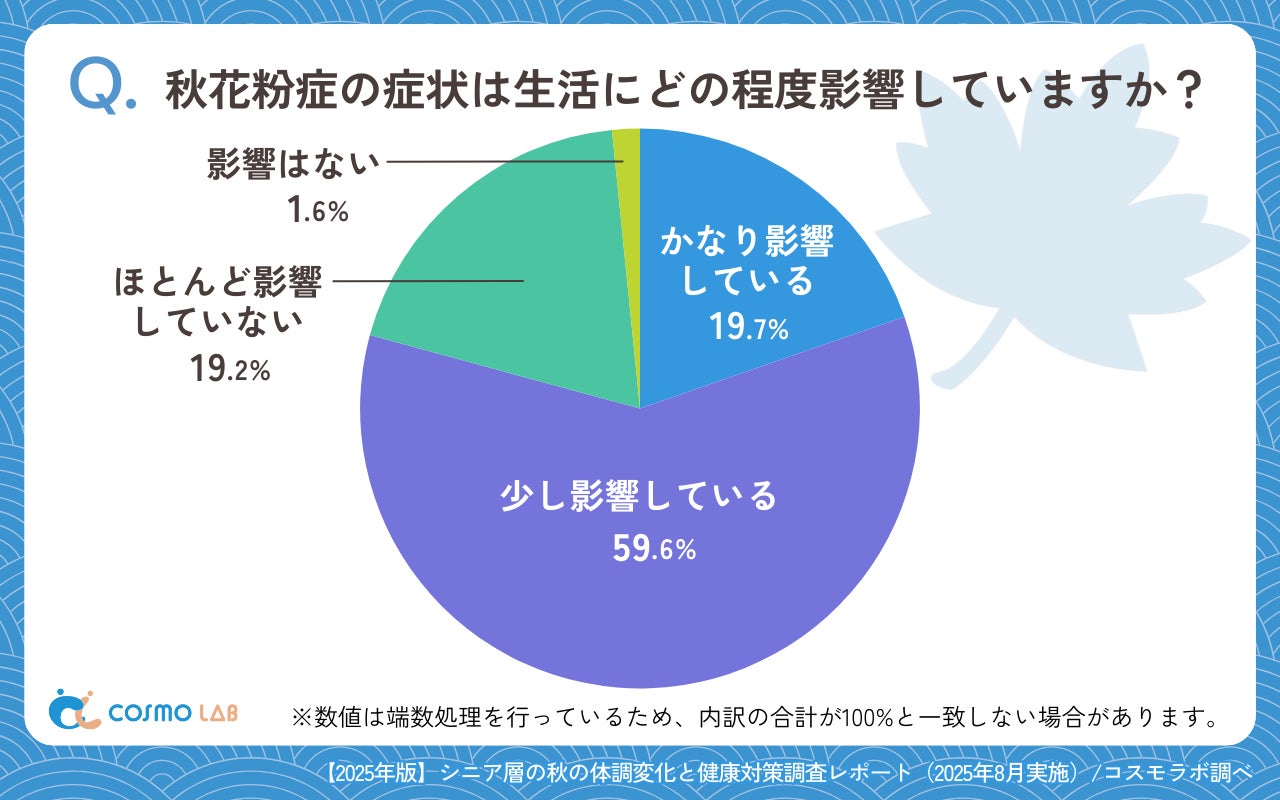 「少し影響している」(59.6%)が約6割で最多で、「かなり影響している」(19.7%)と合わせると約8割が生活への影響を実感しています。「ほとんど影響していない」(19.2%)や、「影響はない」(1.6%)は少数派です。症状を感じる人の約8割が生活への影響を認めている結果は、秋花粉症が単なる軽微な不調ではなく、シニア世代の日常生活の質に影響を与えている問題であることを示しています。