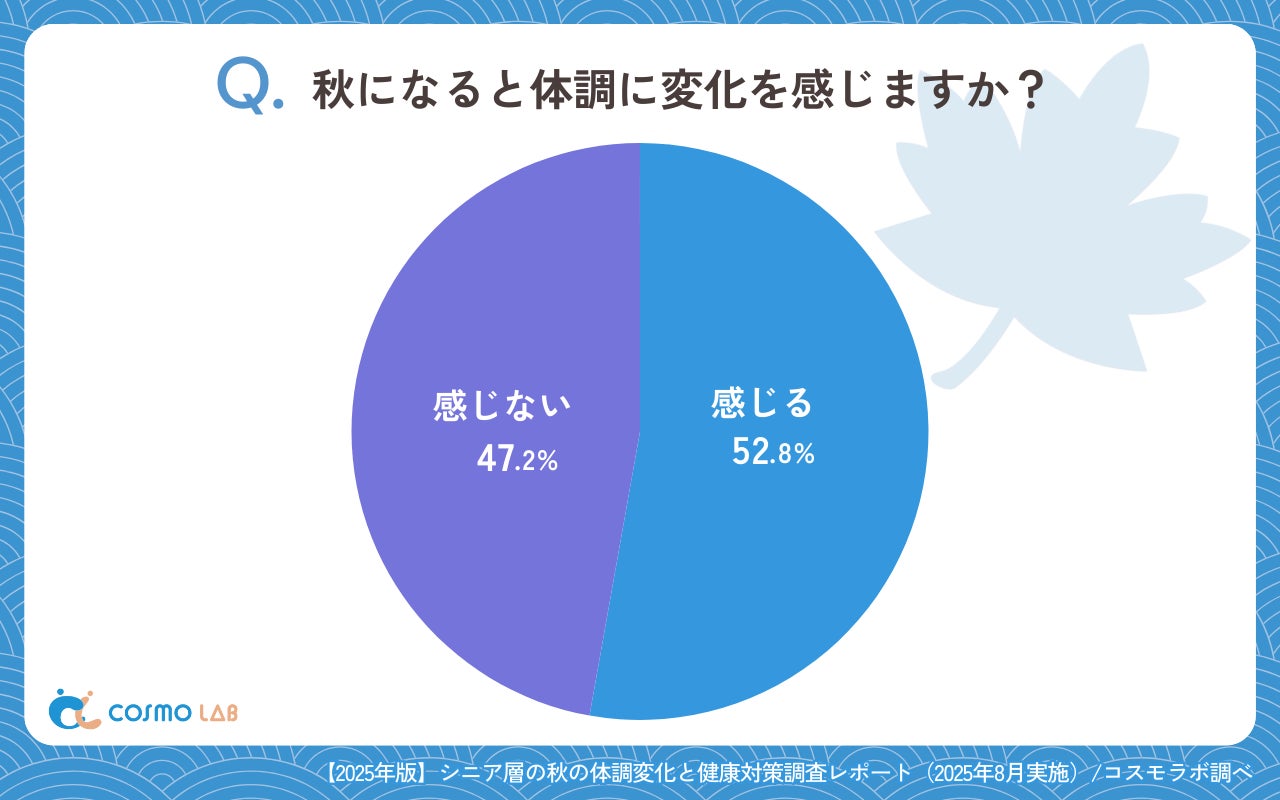 本調査から見えてきたのは、「個人差の大きい季節性健康課題と高い予防意識」というシニア層の秋の健康管理の特徴です。秋の体調変化については「感じる」(52.8%)と「感じない」(47.2%)がほぼ拮抗し、シニア世代でも個人差が大きいことが明らかになりました。