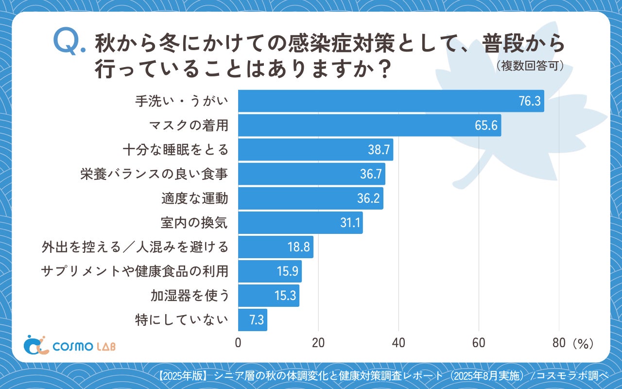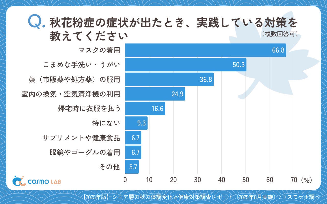 シニア専門のマーケティングプラットホーム コスモラボ(会社名:コスモヘルス株式会社、本社:東京都港区、代表取締役社長 小塚 崇史)がシニア層の『秋の体調変化と対策』に関するアンケートリサーチのレポートをリリースしました。本レポートでは、50歳以上のシニア層を対象に、秋の体調変化や秋花粉症、感染症への不安と対策について意識と実態調査を実施しました。季節の変わり目に直面する不調や予防行動の実情が明らかになりました。