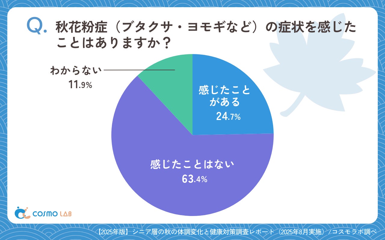「感じたことがある」(24.7%)が約4人に1人で、「感じたことはない」(63.4%)が多数を占めます。「わからない」(11.9%)も1割以上存在し、潜在的な未認識の花粉症の存在が示唆されます。4人に1人が秋花粉症の症状を経験している結果は、春の花粉症ほど知名度は高くないものの、相当数のシニアが秋特有のアレルギー症状に悩まされていることを示しています。