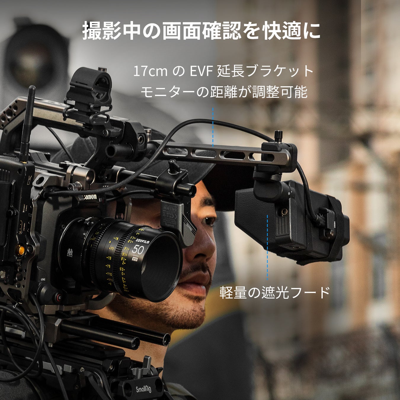 軽量の遮光フードと17cmのEVF延長ブラケットにより、LCDモニターの距離が調整可能になり、撮影中の画面確認を快適性を向上します。