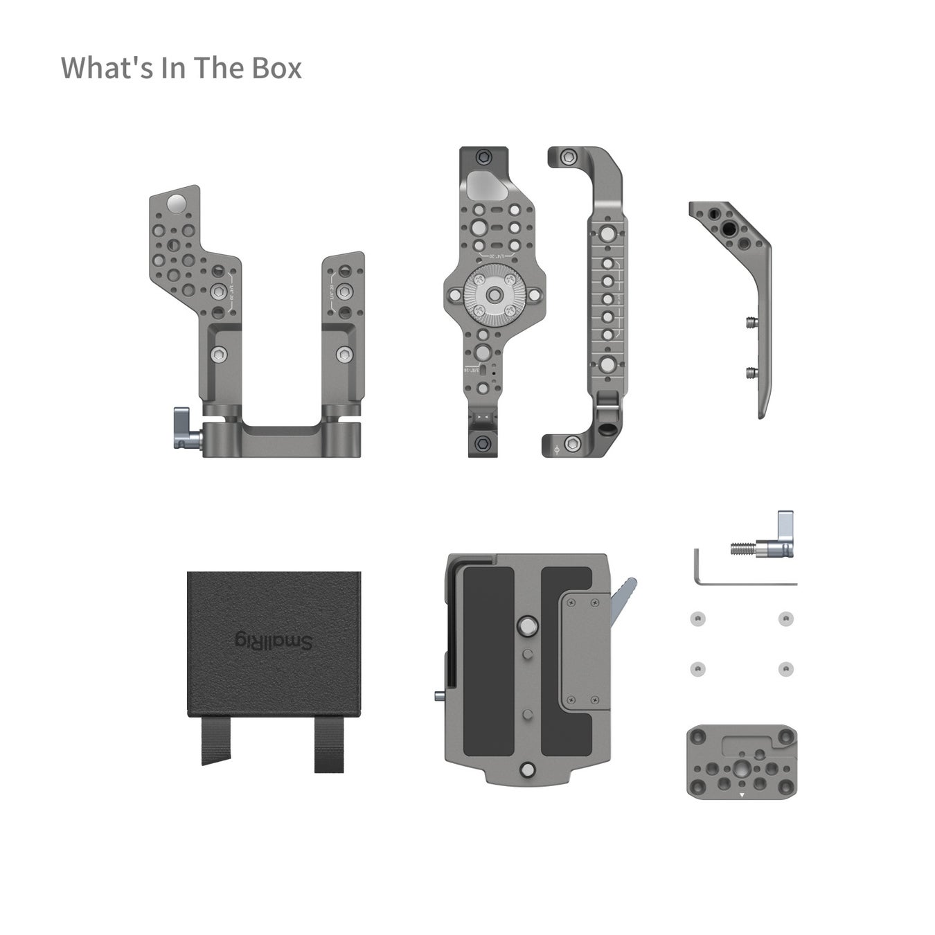 このケージキットには、トッププレート、デュアルサイドプレート、ベースプレート、純正ハンドル用延長モジュール、Vマウントプレート キット、D-タップ‐4ピン電源ケーブル、15mmデュアルロッド、遮光フード、LCDモニター延長用NATOレール、ハンドル ロックノブなどが含まれています。